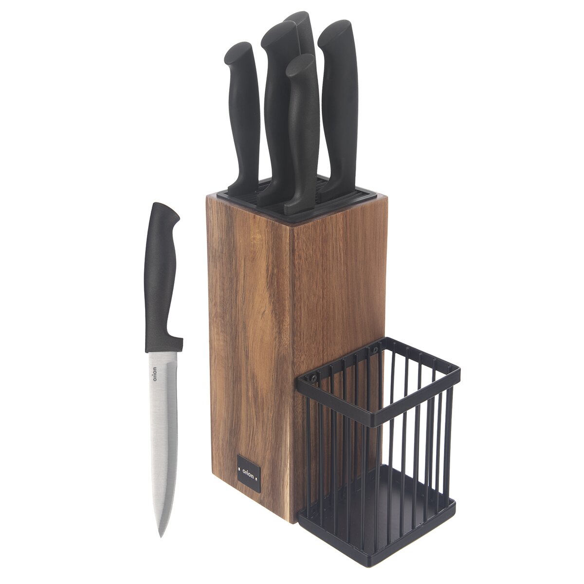 Kód produktu 122999Sada 5 kusů kuchyňských nožů s nerezovou čepelí, uložených v akáciovém stojanu s vkladem se štěrbinami. Stojan je doplněn kovovým postranním košíkem, vhodným k uložení různého kuchyňského náčiní.