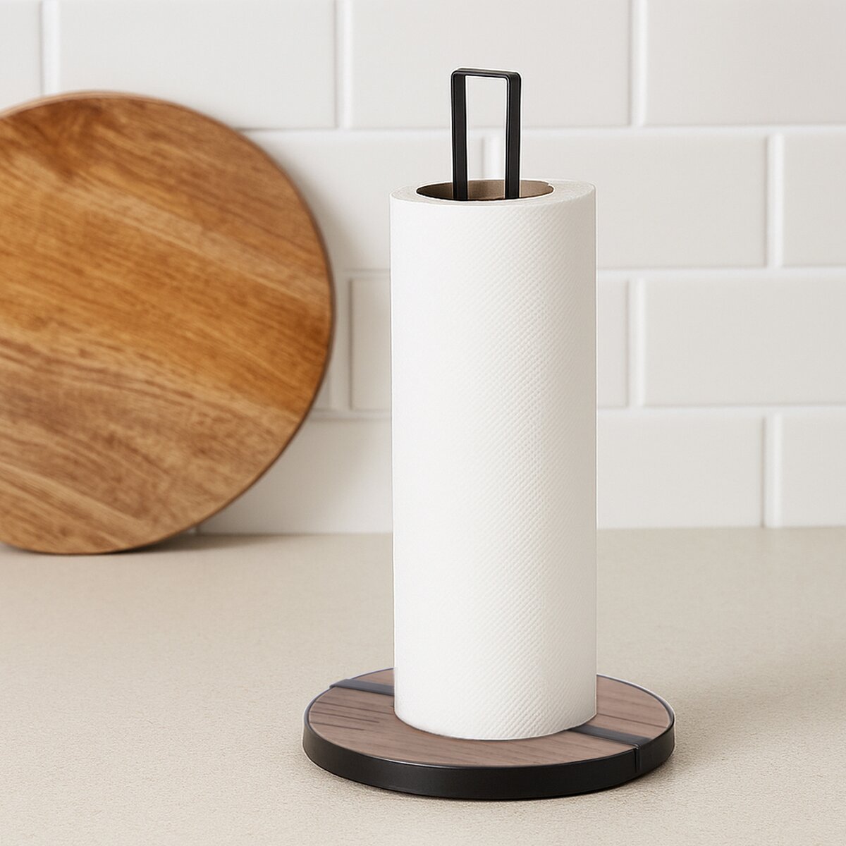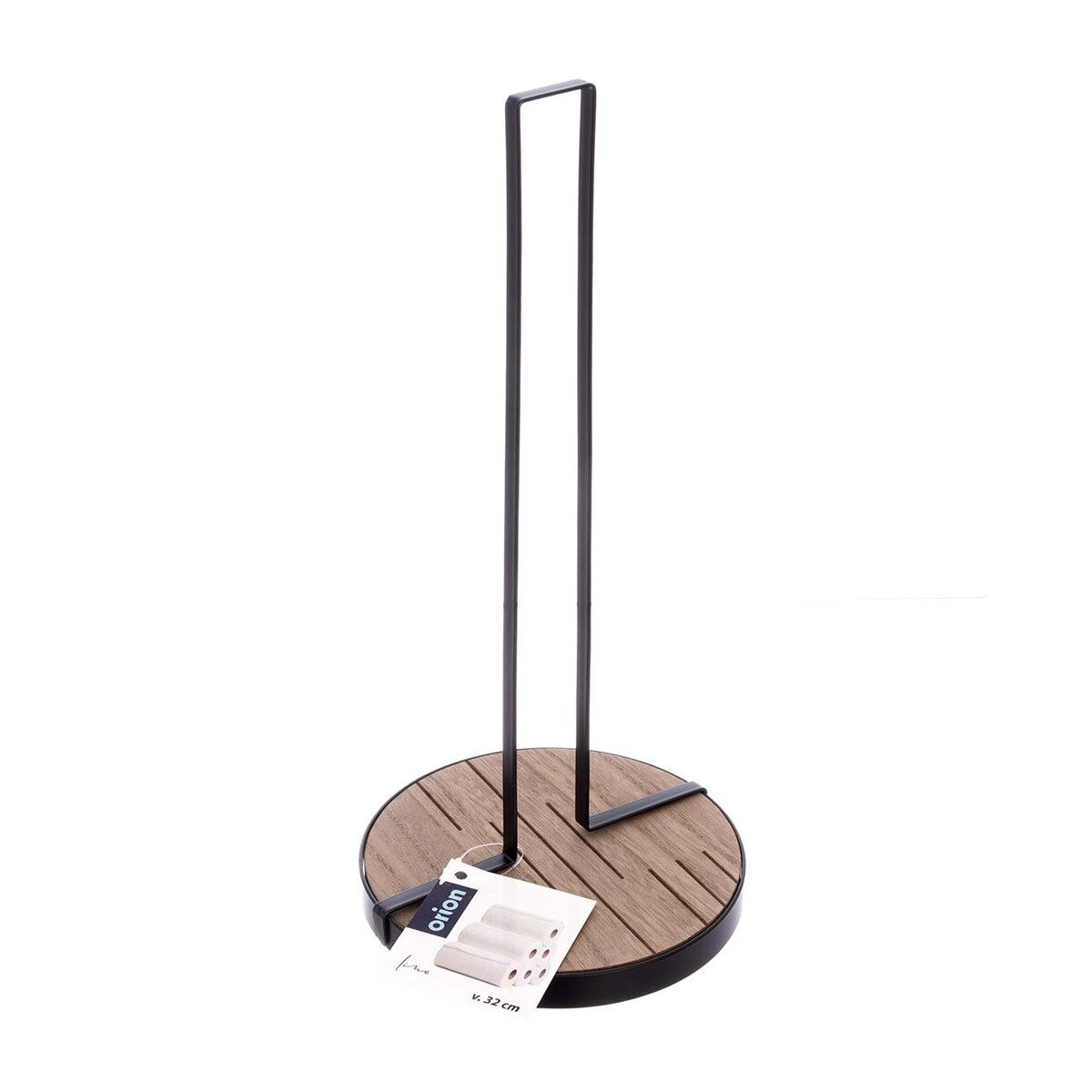 Stojan na papírové utěrky zajistí, že budou mít své stálé místo na kuchyňské lince nebo u stolu. Je kombinací dřevovláknité desky MDF a základny s tyčí z kovu s černým nástřikem.