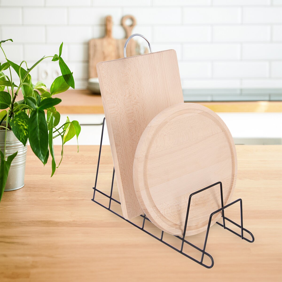 Praktický drátěný stojan s plastovou povrchovou úpravou zajistí bezpečné i přehledné uložení až 6 kusů nerezových, smaltovaných nebo skleněných poklic. Případně jej lze využít k uspořádání krájecích prkének nebo podložek pod hrnce.