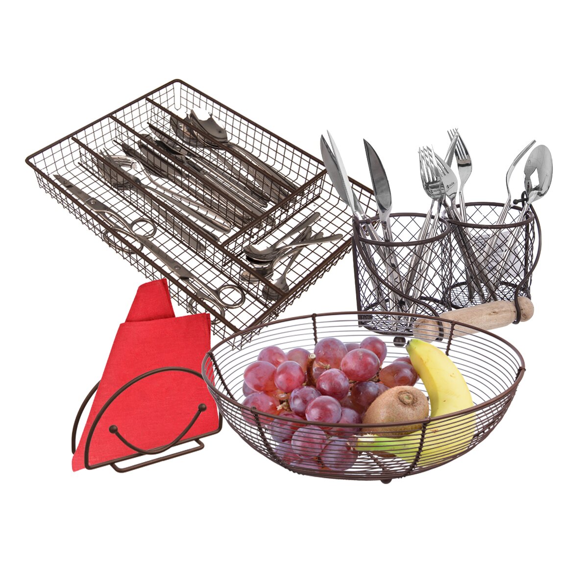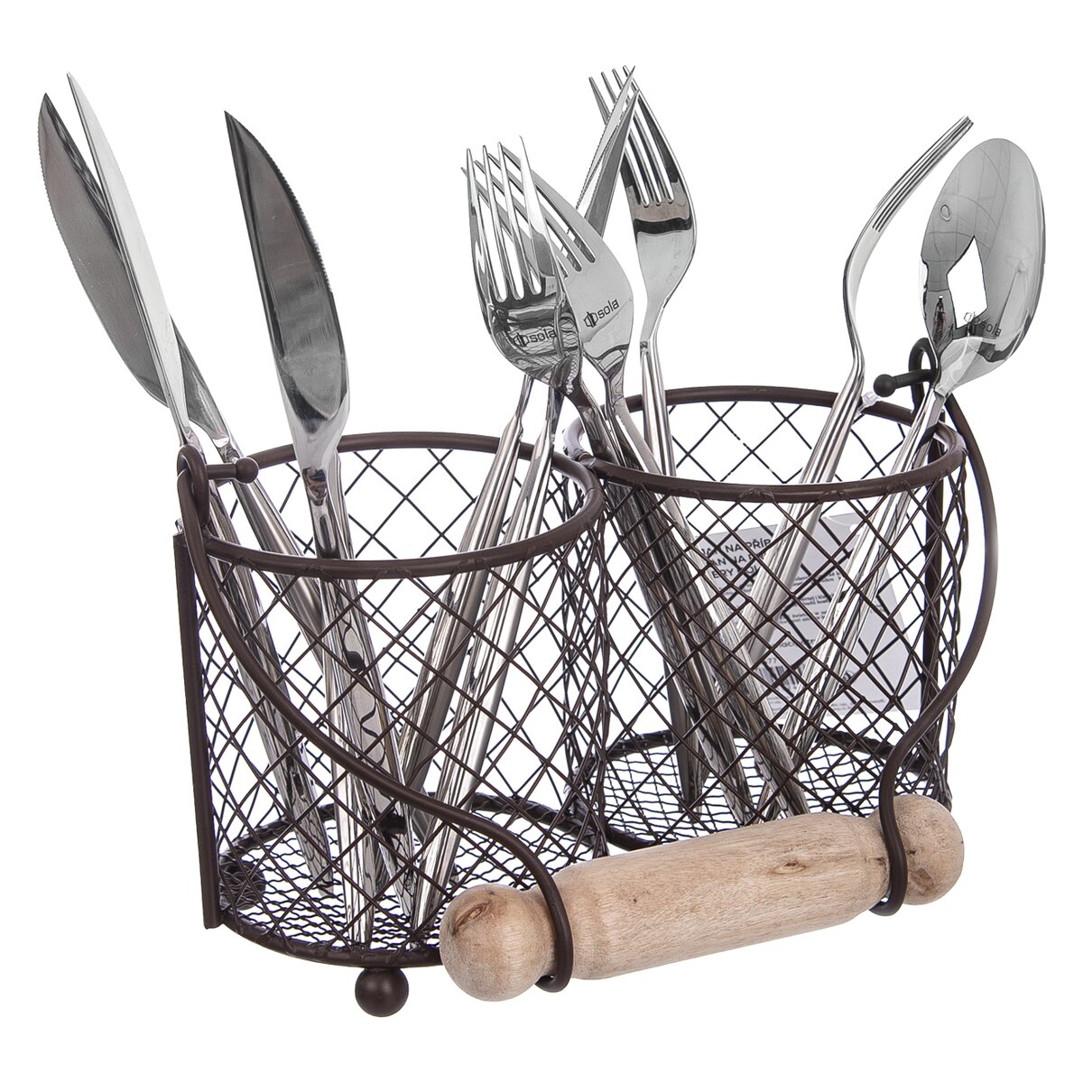 Stojan na příbory bude vypadat skvěle v moderní i klasické kuchyni. Využijete ho také při servírování na terase nebo zahradě, při grilování. Díky sklopnému uchu příbory snadno přenesete a budou hostům hned k dispozici. Materiál: drát s povrchovou úpravou, dřevo. Rozměry: 21x10x17 cm.