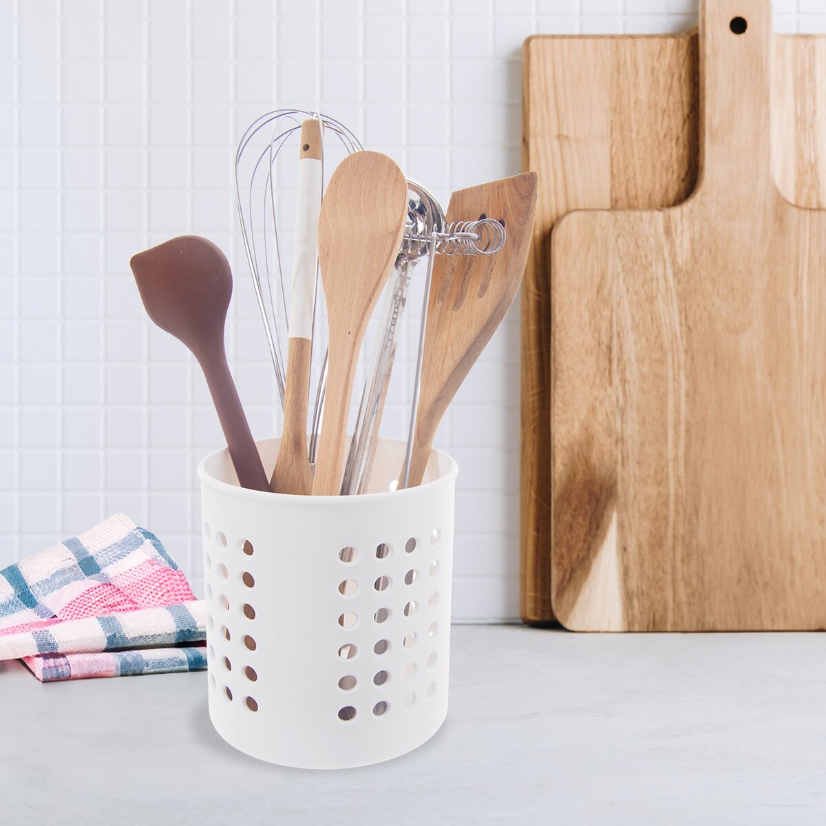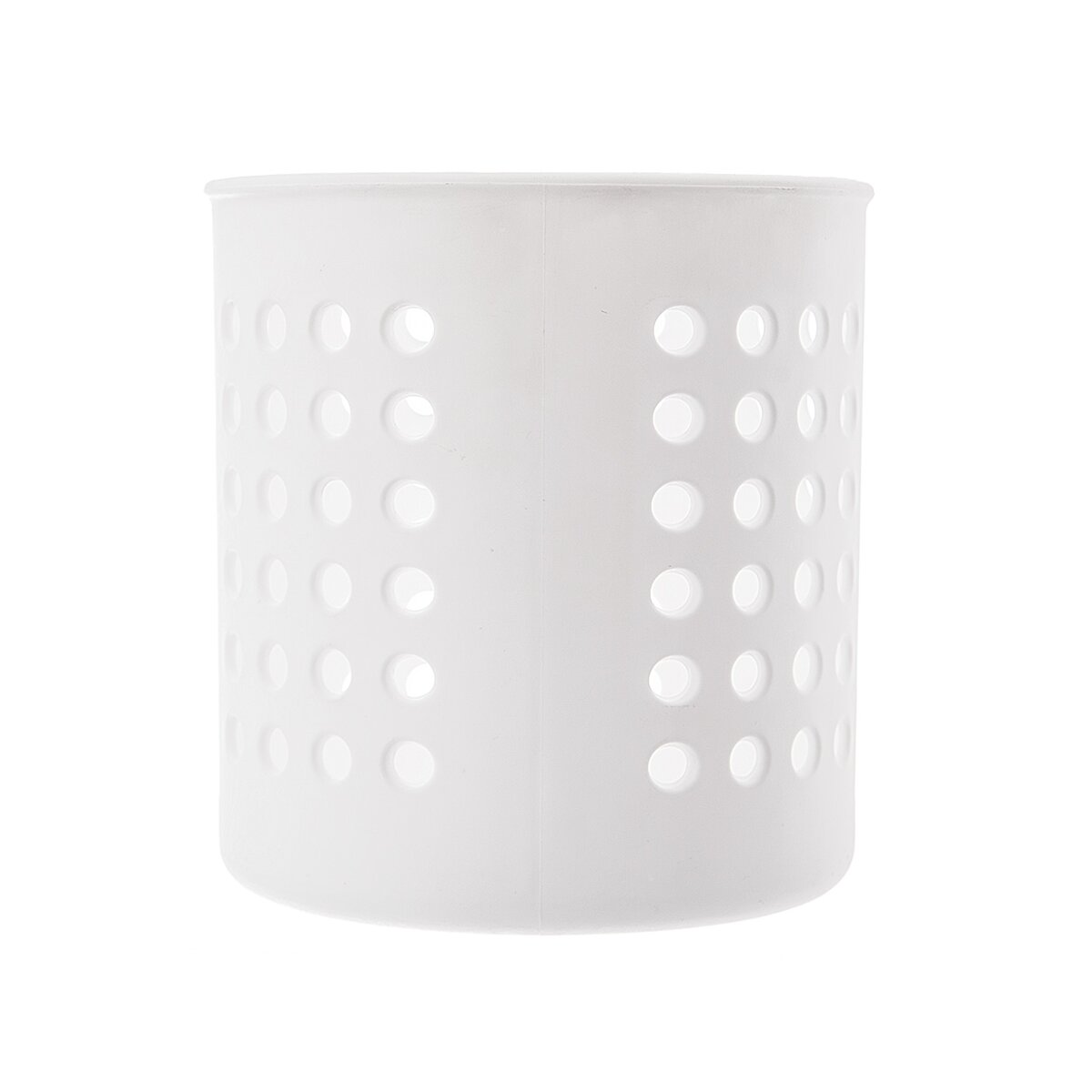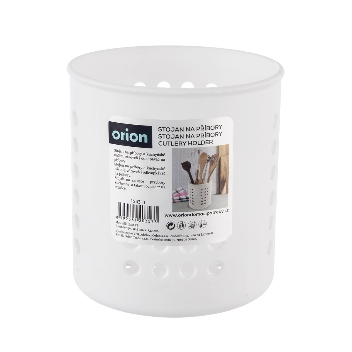 Kód produktu 154311Plastový bílý stojan s otvory je určen k ukládání kuchyňského náčiní na lince, příborů nebo slouží jako odkapávač na příbory.
