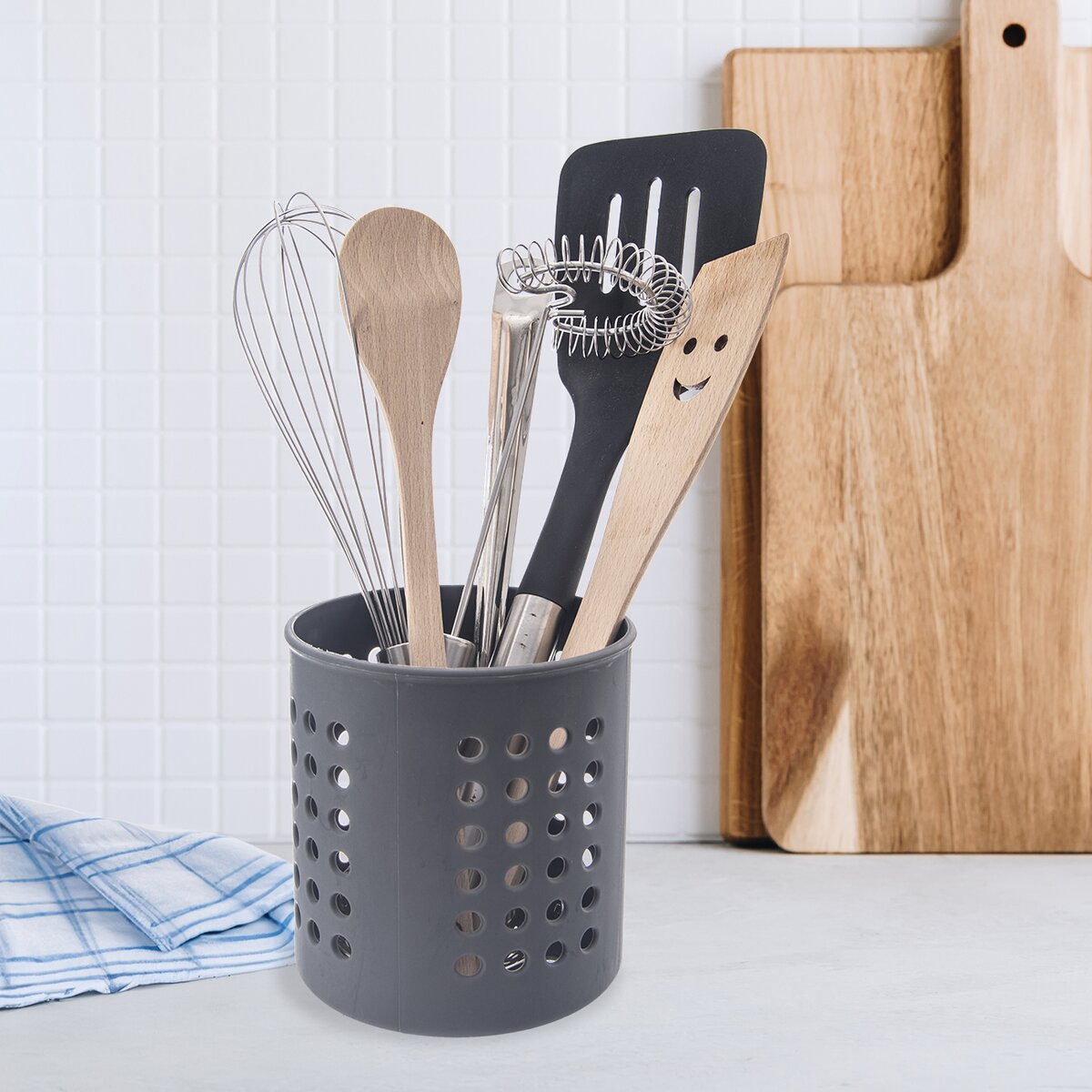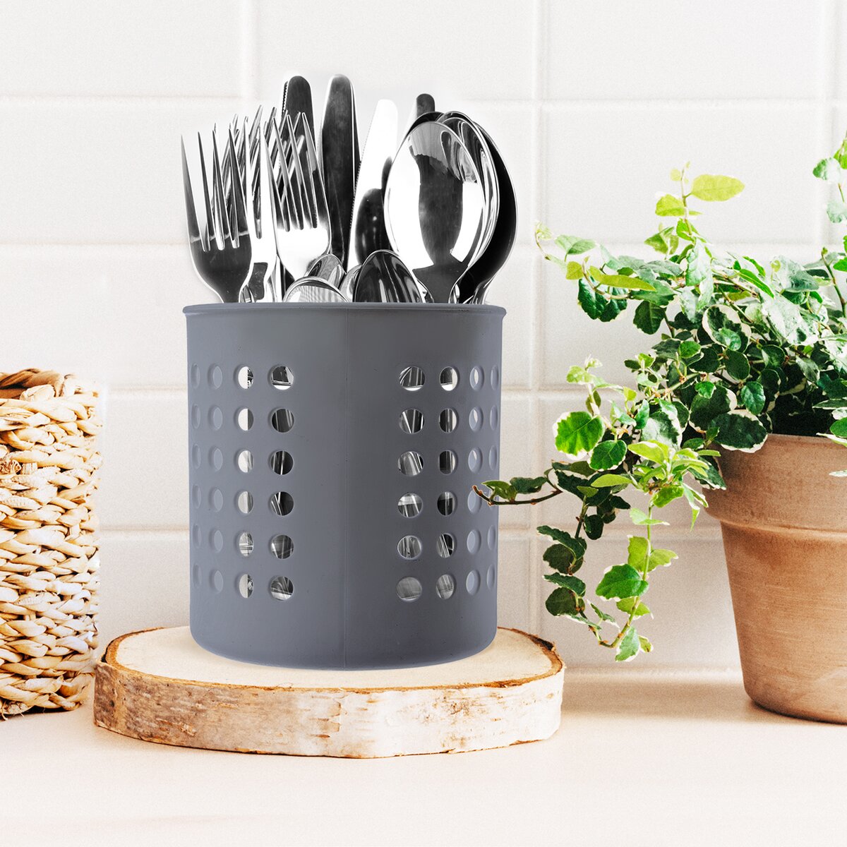 Kód produktu 154312Plastový šedý stojan s otvory je určen k ukládání kuchyňského náčiní na lince, příborů nebo slouží jako odkapávač na příbory.