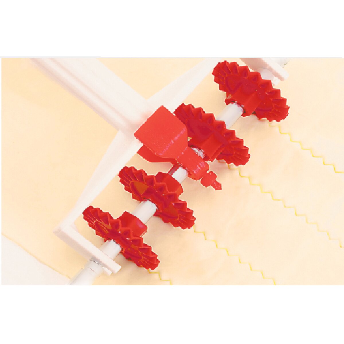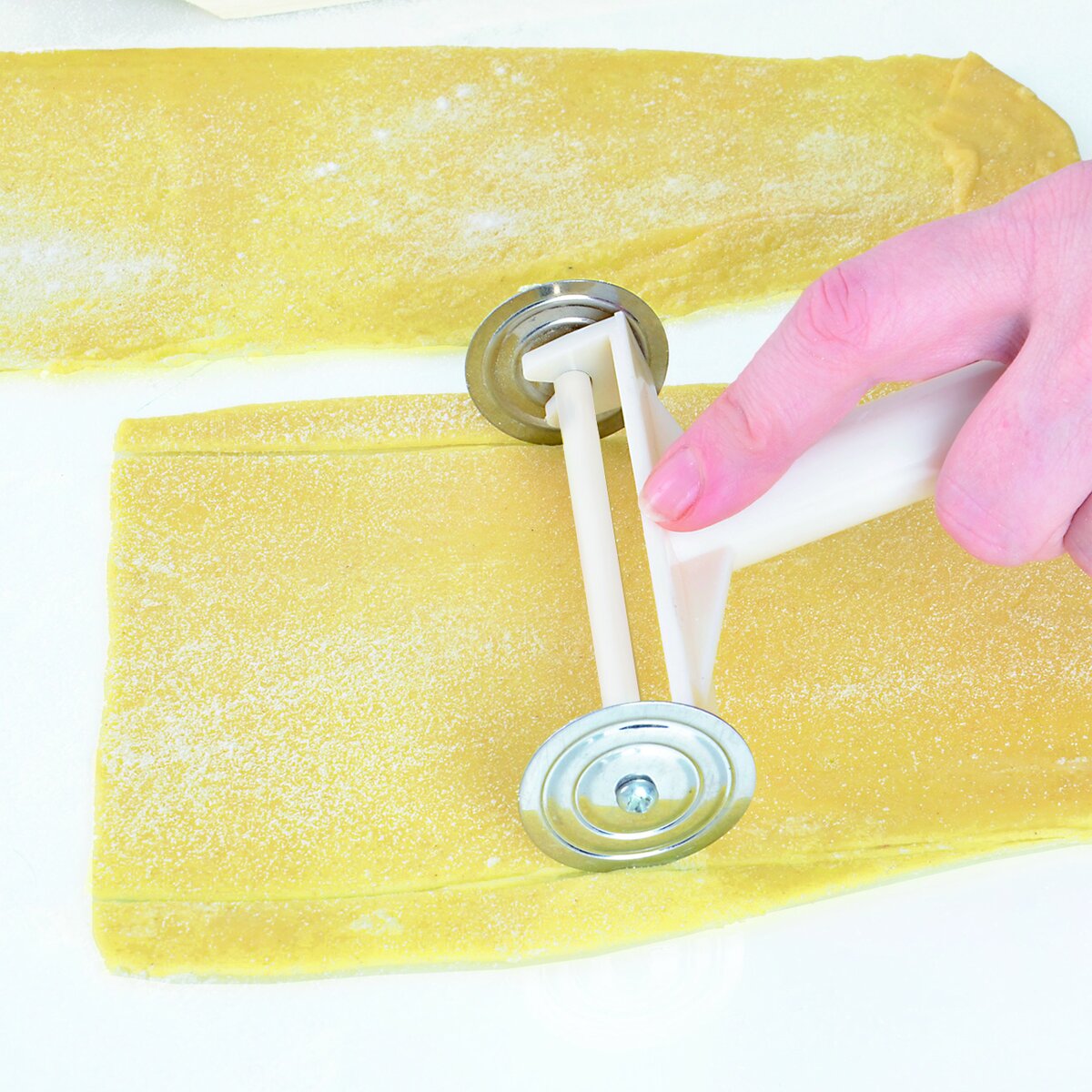 - rádélko se 6 odnímatelnými kroužky, kterými lze vytvořit různě široké pruhy, stejnoměrné čtverečky i různě velká kolečka nejen z nudlového těsta