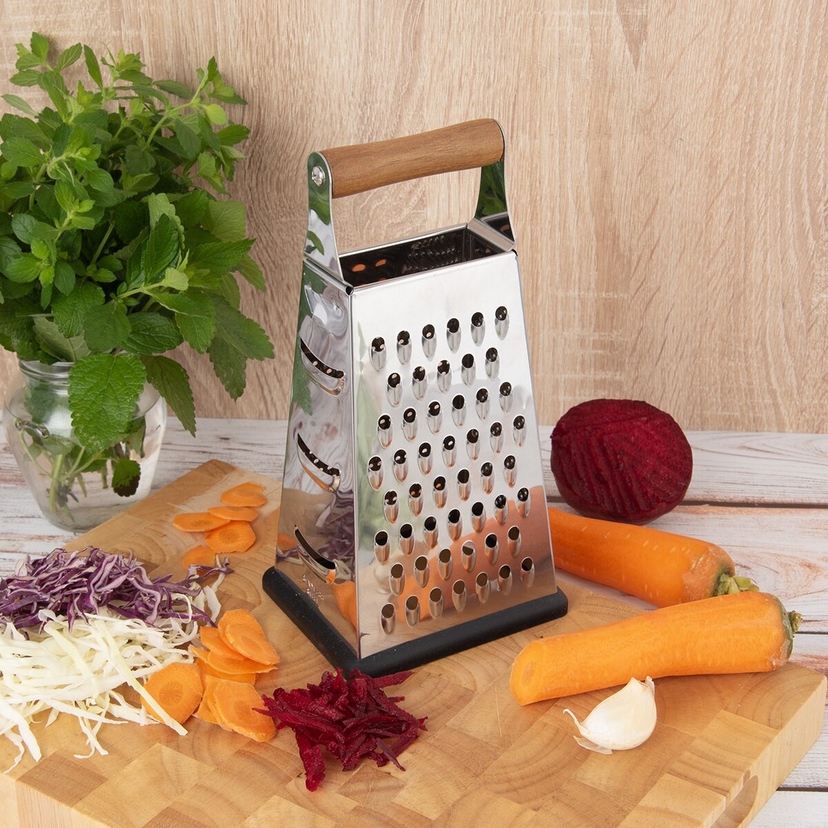 Kód produktu 144807Nerezové čtyřhranné struhadlo s rukojetí z akácie, určené ke strouhání ovoce, zeleniny i sýrů. V dolní části je opatřeno protiskluzovou plochou.