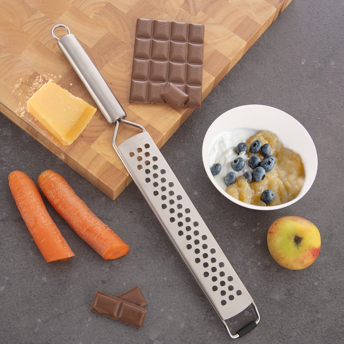 Kód produktu 144809Korunkové nerezové struhadlo délky 37,5 cm je vhodné ke strouhání jablek, zázvoru, křenu, tvrdého sýra, citronové kůry i čokolády. Doplněno krytem pro bezpečné uložení do zásuvky.