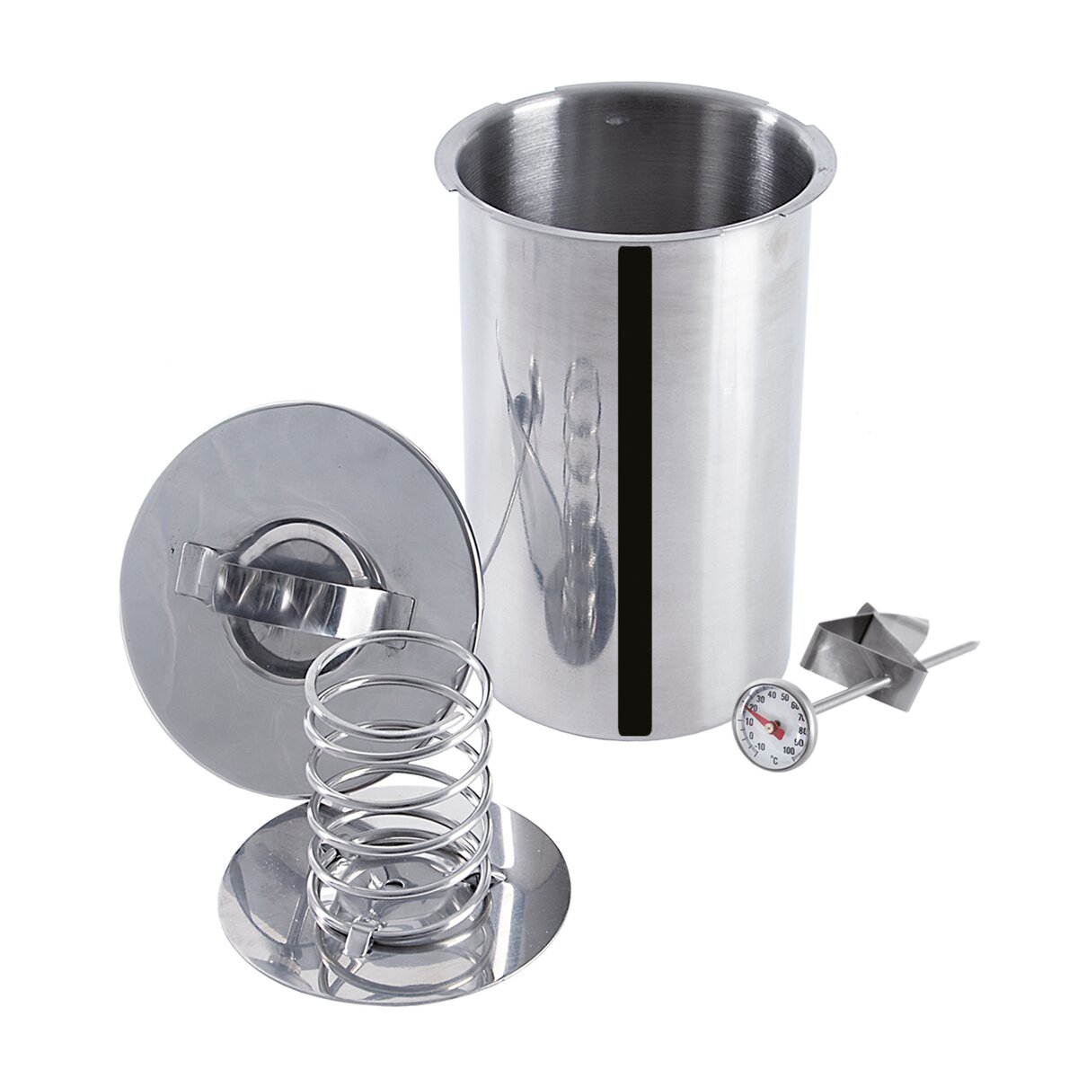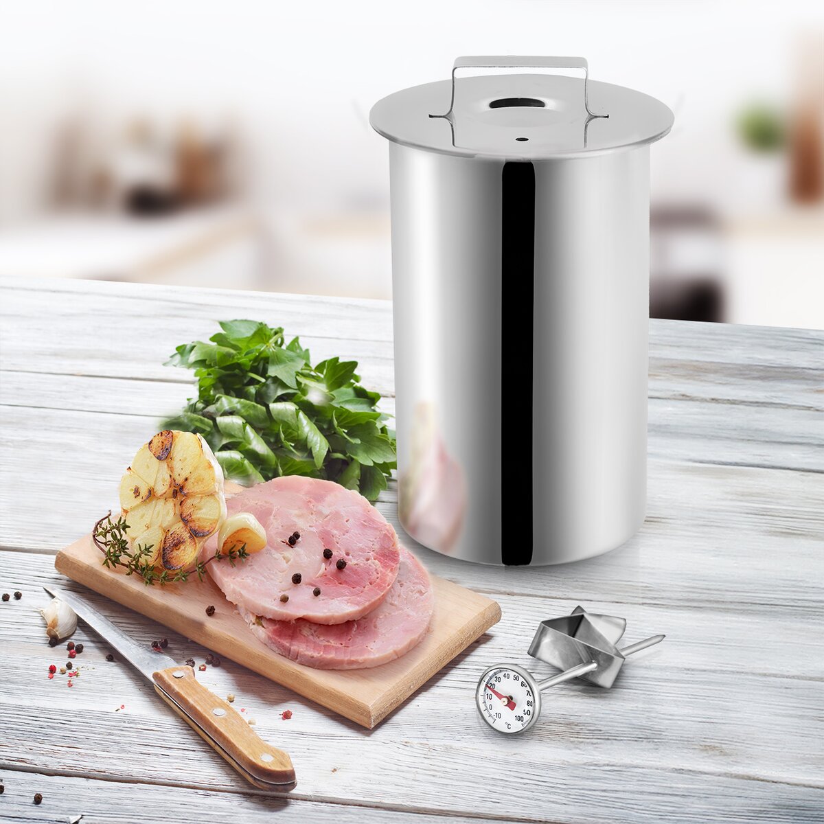 Kód produktu 131517Nerezový šunkovar o průměru 10 cm, s víčkem opatřeným pružinou a s teploměrem, ideální pro přípravu a vaření cca 1 kg domácí šunky. Lze jej mýt v myčce nádobí.