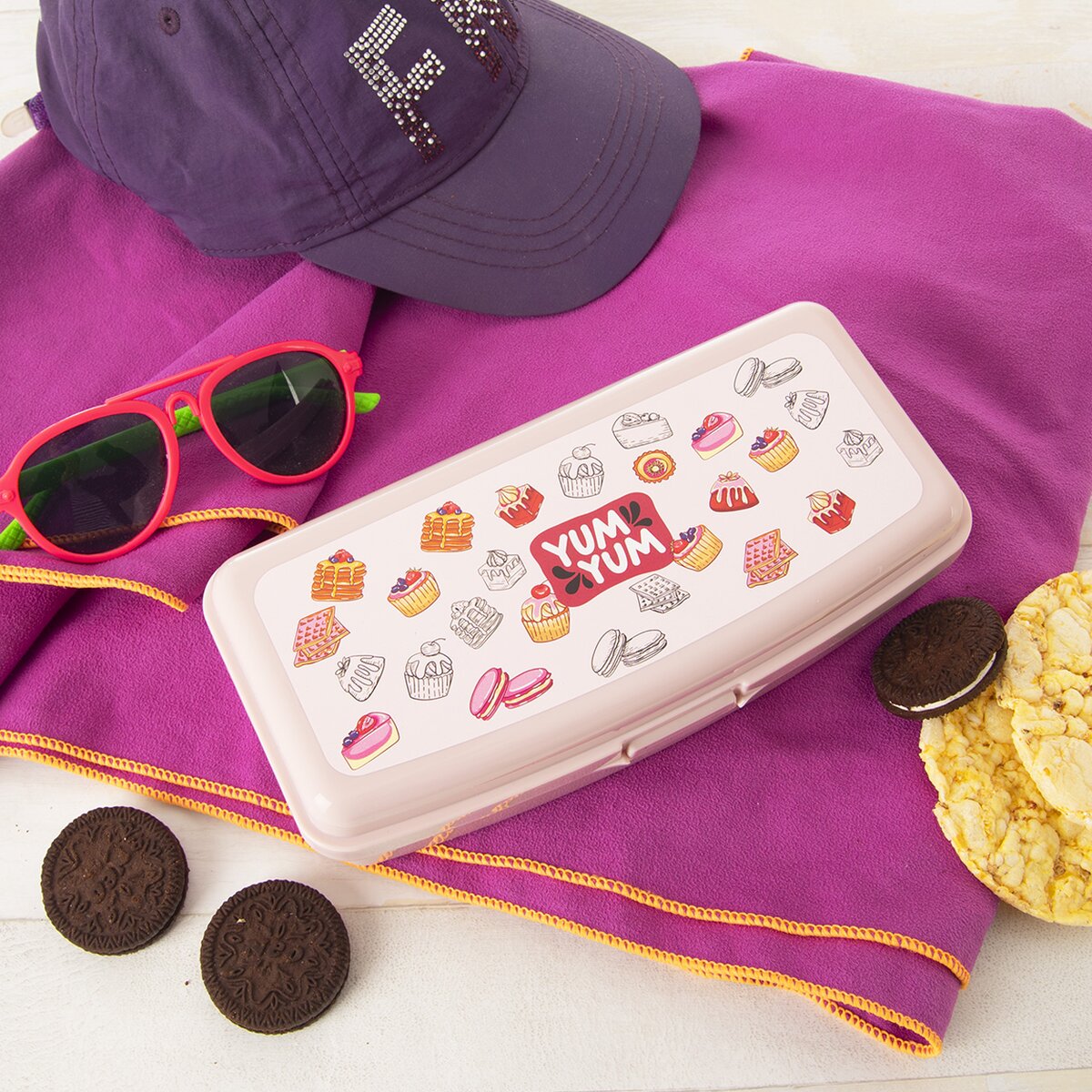 Kód produktu 154043Plastový delší box velikosti 20,5x10x5,5 cm, vhodný k uložení svačiny do školy, na výlet i dovolenou. Víčko s dekorem dortíků, které uzavře box na klip.