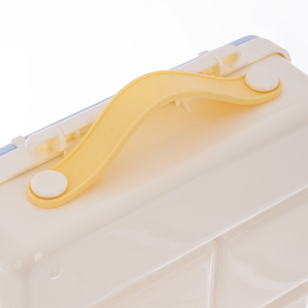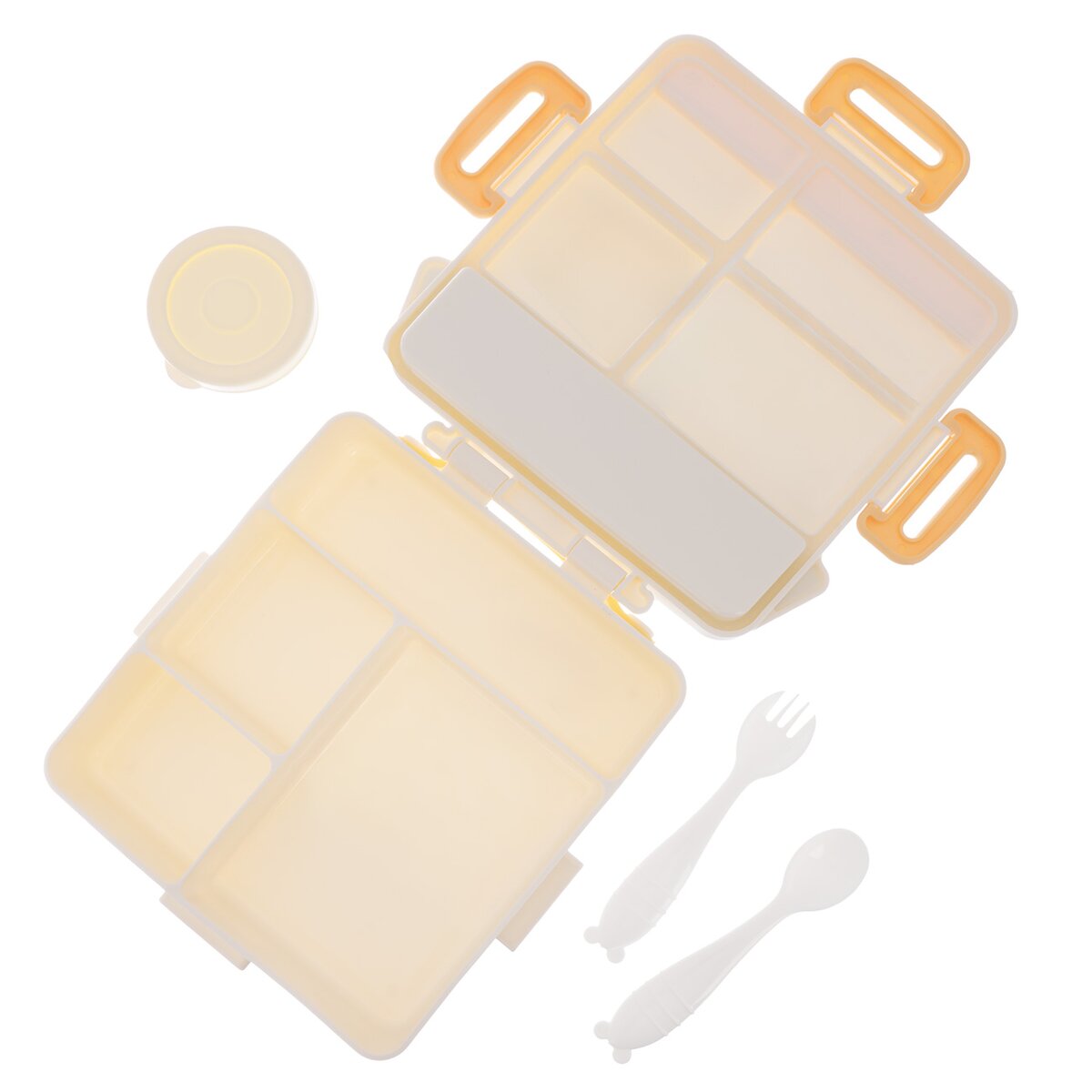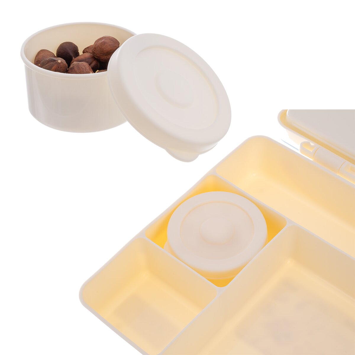 Kód produktu 154080Dětský svačinový box se čtyřmi přihrádkami, mističkou a příborem, s těsněním ve víčku a praktickým uchem. Designed by Orion.