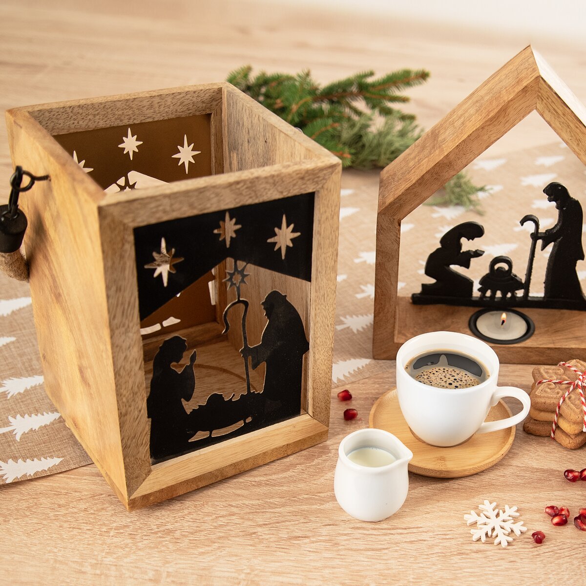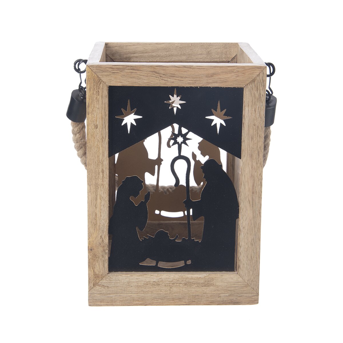 Kód produktu 351839Hranatý svícen s krásnou texturou mangového dřeva a černou kovovou siluetou z Betléma je vhodný jako dárek nebo z něho bude stylový kousek do interiéru. Lze jej zavěsit za jutové držadlo.