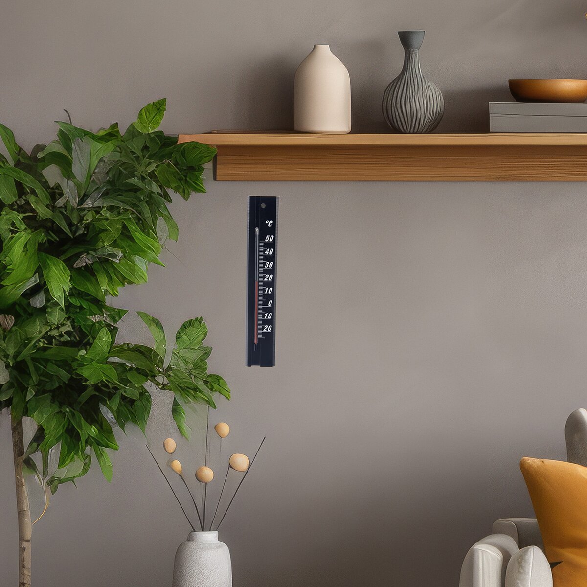 Tento nástěnný dřevěný teploměr v černé barvě se hodí k měření teploty jak ve vnitřních, tak i krytých venkovních prostorech. Má otvor k zavěšení a obsahuje petrolejovou náplň.