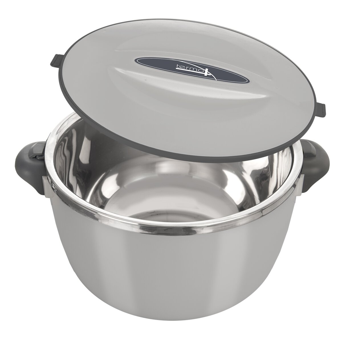 Kód produktu 128524Praktická šedá plastová termomísa TERMO má celkový objem 3,9 l. Je opatřena hladkým nerezovým vnitřkem a otočným termo víčkem. Slouží k uchování vložených teplých nebo studených pokrmů.