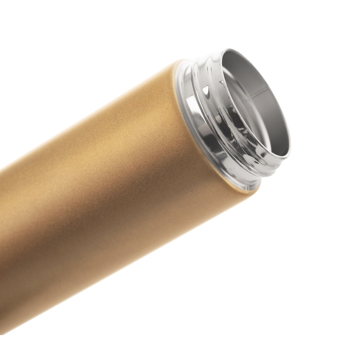 Kód produktu 125899Nerezová termoska ve zlaté barvě o objemu 0,45 l, je opatřena víčkem s LED displejem. Indikátor ukazuje aktuální teplotu nápoje uvnitř dvoustěnné termosky.