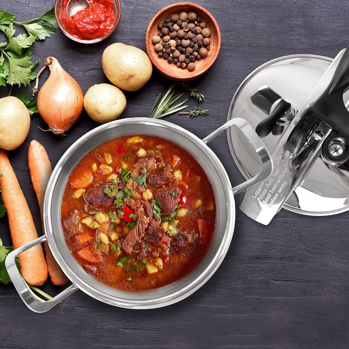Menší silnostěnný hrnec s akutermickým dnem se uzavírá bezpečnou tlakovou poklicí s pákovým systémem. Díky ní lze rychleji uvařit maso na guláš, králíka na smetaně, segedínek nebo kuře na paprice. A kdo nemá čas několik hodin táhnout masový vývar, ocení rychlou a jednoduchou přípravu.