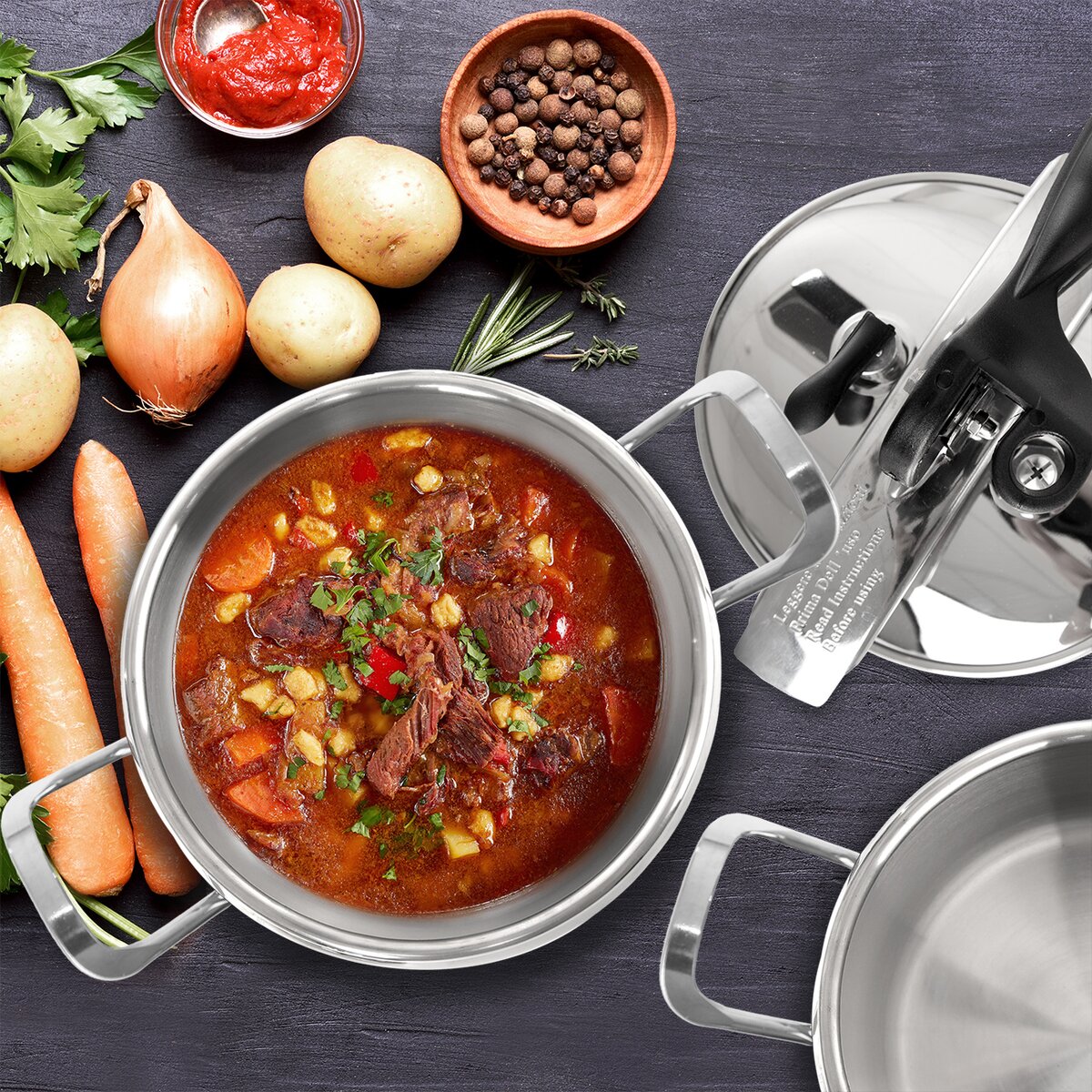 Silnostěnné hrnce se sendvičovým dnem se uzavírají bezpečnou tlakovou poklicí s pákovým systémem, díky níž lze rychleji uvařit hovězí maso na guláš, králíka na smetaně, segedínek nebo koleno, které lze jíst vařené nebo ho vložit ještě do trouby a dopéct dozlatova. A kdo nemá čas několik hodin táhnout masový vývar, ocení rychlou a jednoduchou přípravu.