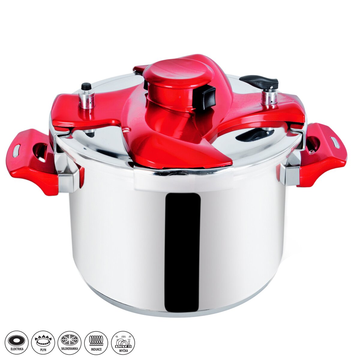 Kód produktu 111790Moderní konstrukce tlakového hrnce v unikátním designu. Tlakový hrnec z vysoce kvalitní nerezové oceli je opatřen 3-vrstvým akutermickým dnem, které díky svým vynikajícím termo - akumulačním vlastnostem spoří výrazně tepelnou energii i čas strávený při přípravě pokrmů. Ideální nádobí pro přípravu silných masových nebo zeleninových vývarů, oblíbených gulášů, ragú, veškerého masa vyžadujícího delší úpravu, luštěnin… Tlakový hrnec je opatřen víkem se speciální konstrukcí otevírání a zavírání, bezpečnostním a pracovním ventilem pro upouštění tlaku. Materiál: vysoce kvalitní nerezová ocel. Vhodný na všechny typy spotřebičů včetně indukce, vhodný do myčky. Rozměry: objem 5 l, pr. 23 cm, v. 14,5/20,5 cm. Náhradní těsnění v naší nabídce 180519.