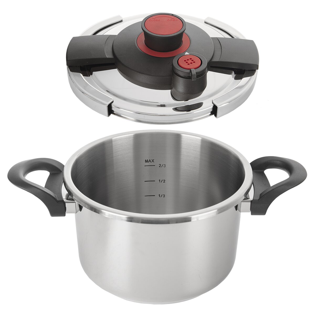 - poklice s rukojetí z bakelitu a s bajonetovým zavíráním pro bezpečné uzavření hrnce bez potřeby síly