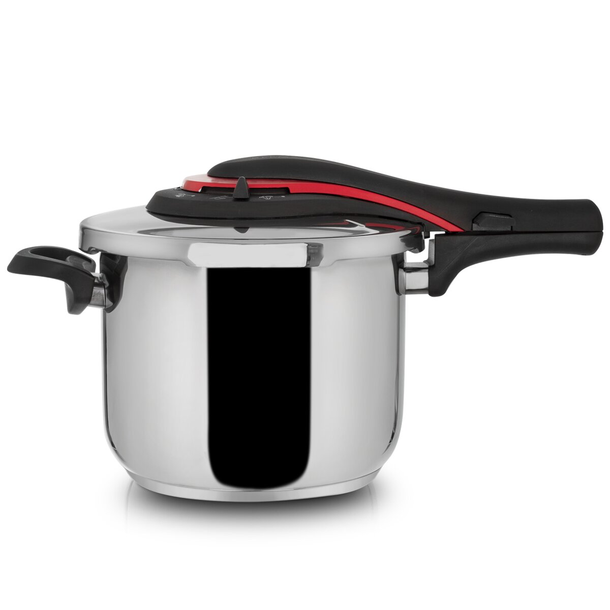 Kód produktu 113186Designový tlakový hrnec UPLINE o objemu 6 l s bajonetovým uzavíráním a bezpečnostními prvky, vhodný pro rychlé vaření na všech typech sporáků, včetně indukce.
