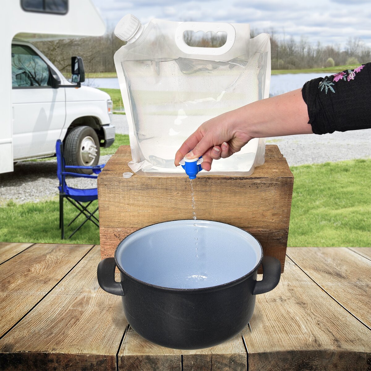 Více informacíPřenosný transparentní vak, který plně nahradí klasické plastové barely na vodu, má objem 4,8 l. Navíc vypuštěný nezabere téměř žádné místo, takže jeho použití v kempech, karavanu nebo na chatě je jasné. Má široký šroubovací uzávěr s víčkem na závit, skrz něj vak pohodlně naplníte. Z kohoutku v kuchyni, ale i v umývárně v kempu. Vodu na pití, vaření či umývání lze vypouštět jak dolním ventilem, který je při zakoupení kryt plombou, tak plnicím uzávěrem bez víčka.