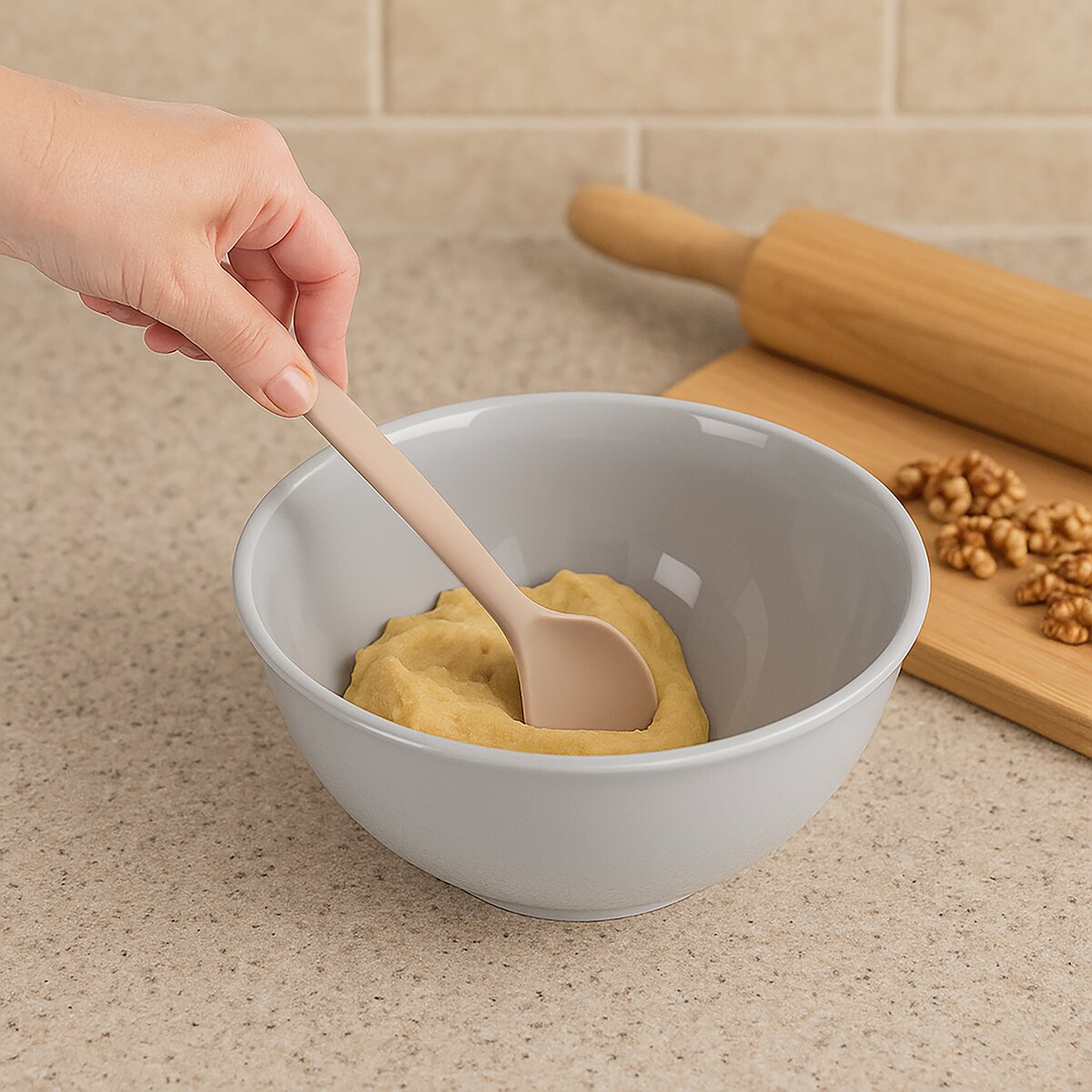 Kulatá silikonová vařečka v béžové barvě pomůže při vaření oblíbených omáček, jemných krémů, nadýchaných kaší a dalších pokrmů. Je odolná vůči vysokým teplotám, ideální k vaření, dušení a pečení v nádobí s nepřilnavým povrchem, který zaručeně nepoškrábe. S možností zavěšení.