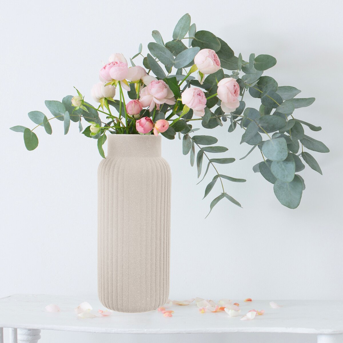 Stylová porcelánová váza s hrubou povrchovou strukturou a podélným žebrováním bude ozdobou stolu, okenního parapetu i komody. Krásnou dekoraci a dotek přírody v interiéru vykouzlíte lučními květinami, moderní vazbou z frézií, eukalyptu a hortenzií i sušenými květinami nebo bodláčím.