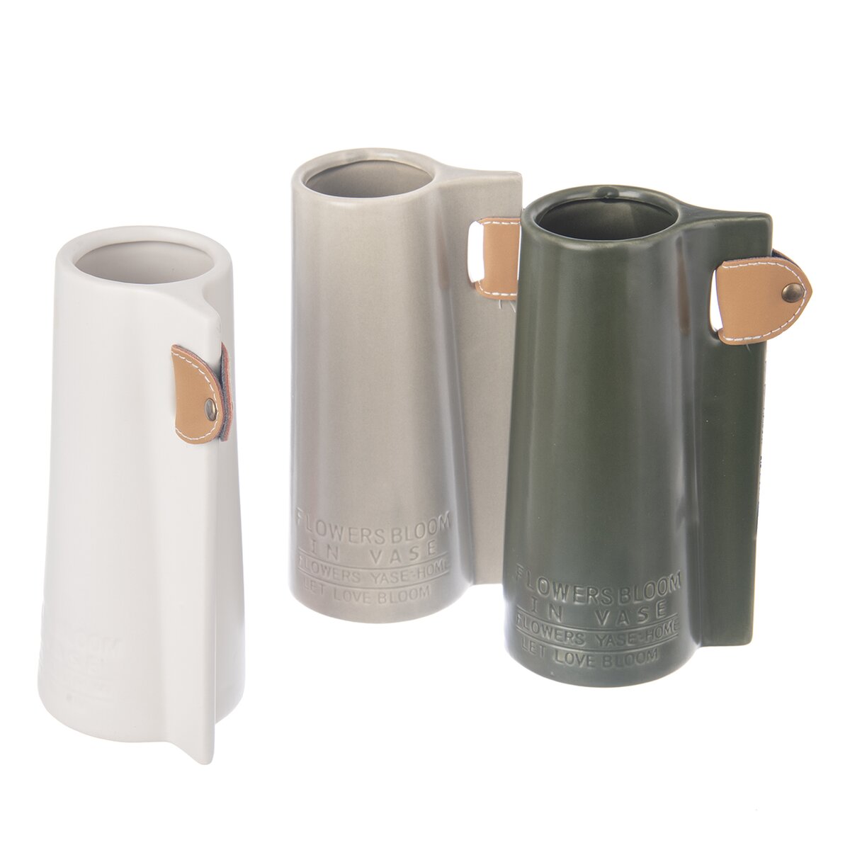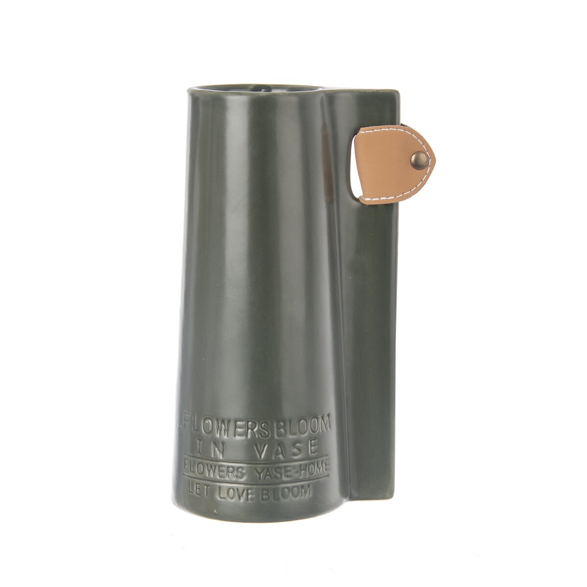 Kód produktu 820176Menší glazovaná keramická váza se zajímavě řešeným držadlem a koženkovým detailem je určena k umístění řezaných a sušených květin i jako samostatný designový objekt.