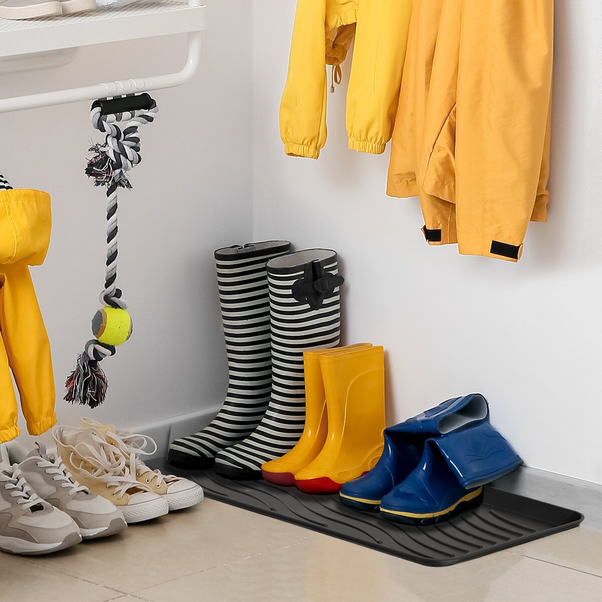 V deštivém počasí, po sportu i práci na zahradě dojde ke znečištění obuvi. Proto je šiková rohož z plastu PP vhodným místem, kam mokrou obuv odložit tak, aby podlaha zůstala čistá. Před vchodem, na terase i uvnitř bytu, na chodbě. Všude tam můžete umístit tento velký odkapávač. Výrazné výstupky usnadní odkapání tajícího sněhu a vody z podrážek.