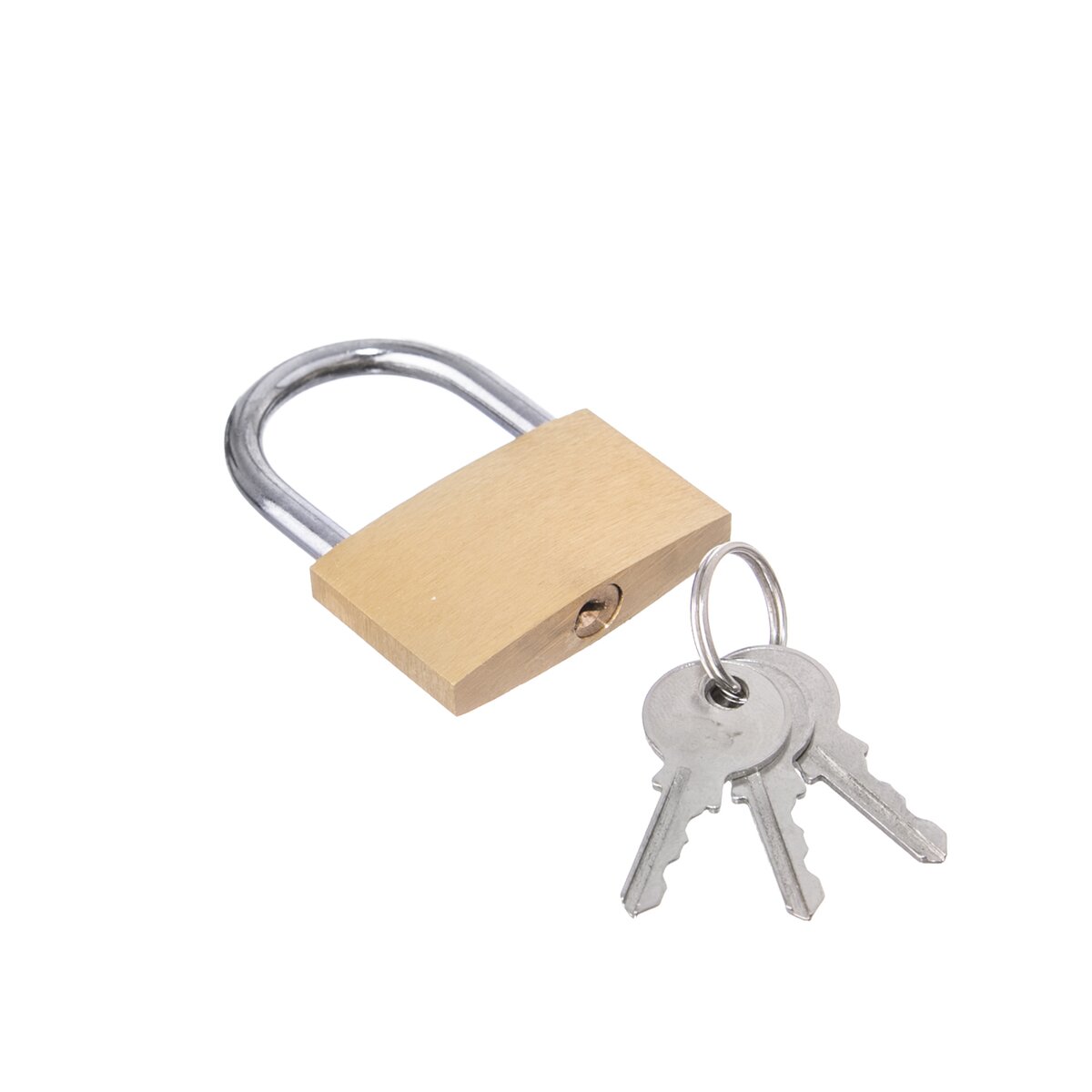 Kód produktu 810461Železný visací zámek o rozměrech 3,7×0,8×5,2 cm se třemi klíči.