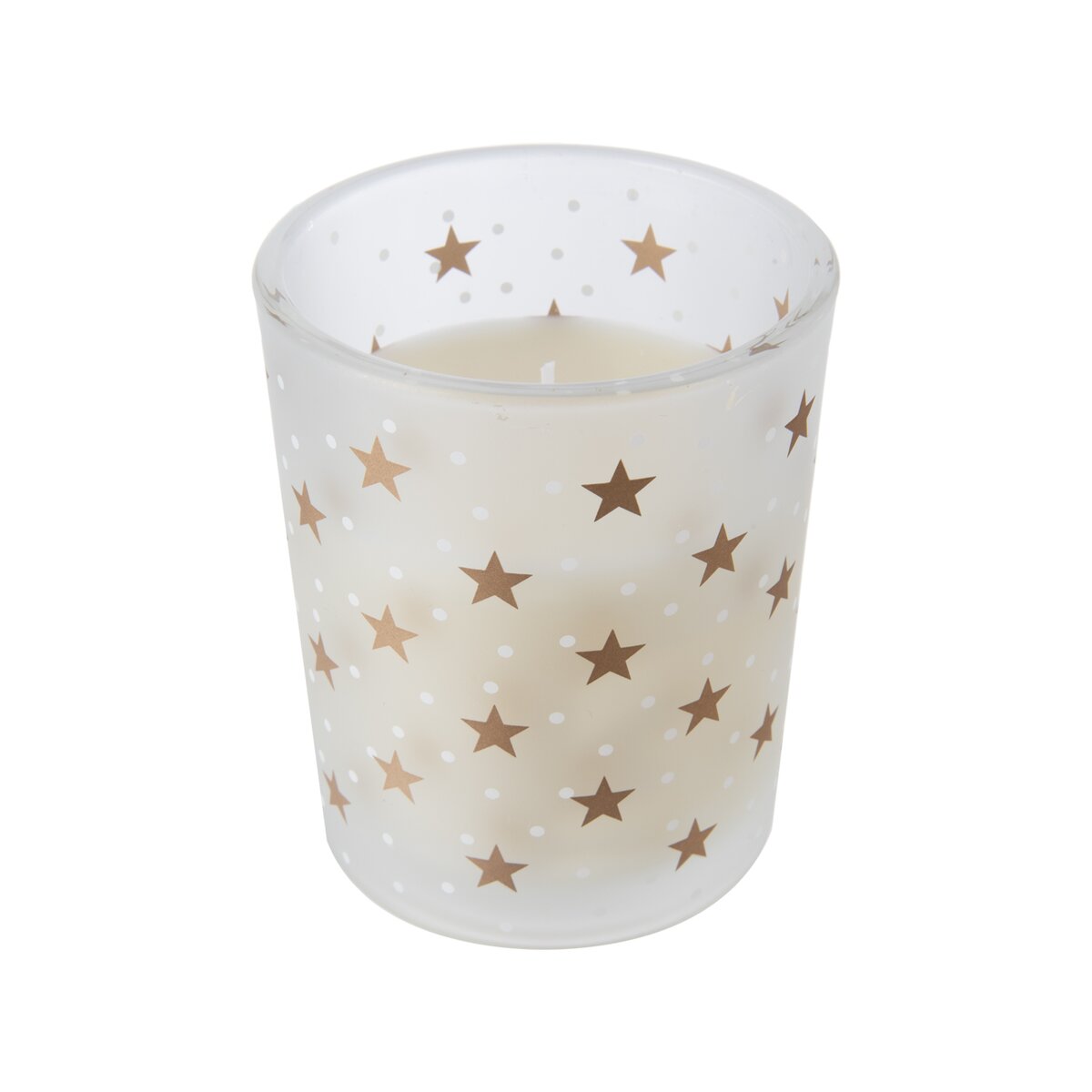 Svíčka z vosku má bavlněný knot a je vsazena do skleněného obalu, zdobeného dekorem sněhových vloček.