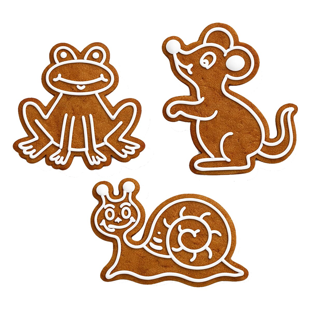 Kód produktu 132627Sada 3 nerezových vykrajovaček ve tvaru myšky, žabky a šnečka je určena k vykrajování perníčků, sušenek, marcipánu i pro jiné kreativní práce.