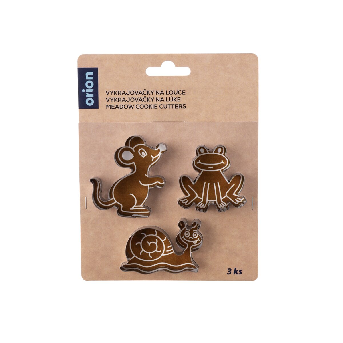 Rozměry vykrajovaček: myška 5,5x6x1,5 cm, žába 5x5x1,5 cm, hlemýžď 6x4x1,5 cm. Na zadní straně obalu navíc najdete recept na přípravu perníkového těsta.