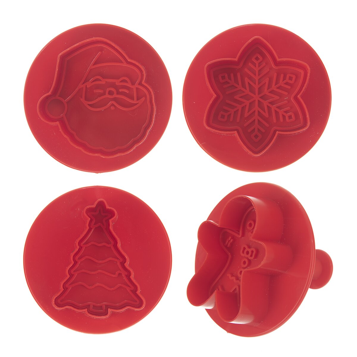 Kód produktu 127456Sada 4 kusů vánočních plastových vykrajovaček s pístem má na spodní straně razítko s reliéfem, který se otiskne do vyváleného těsta.