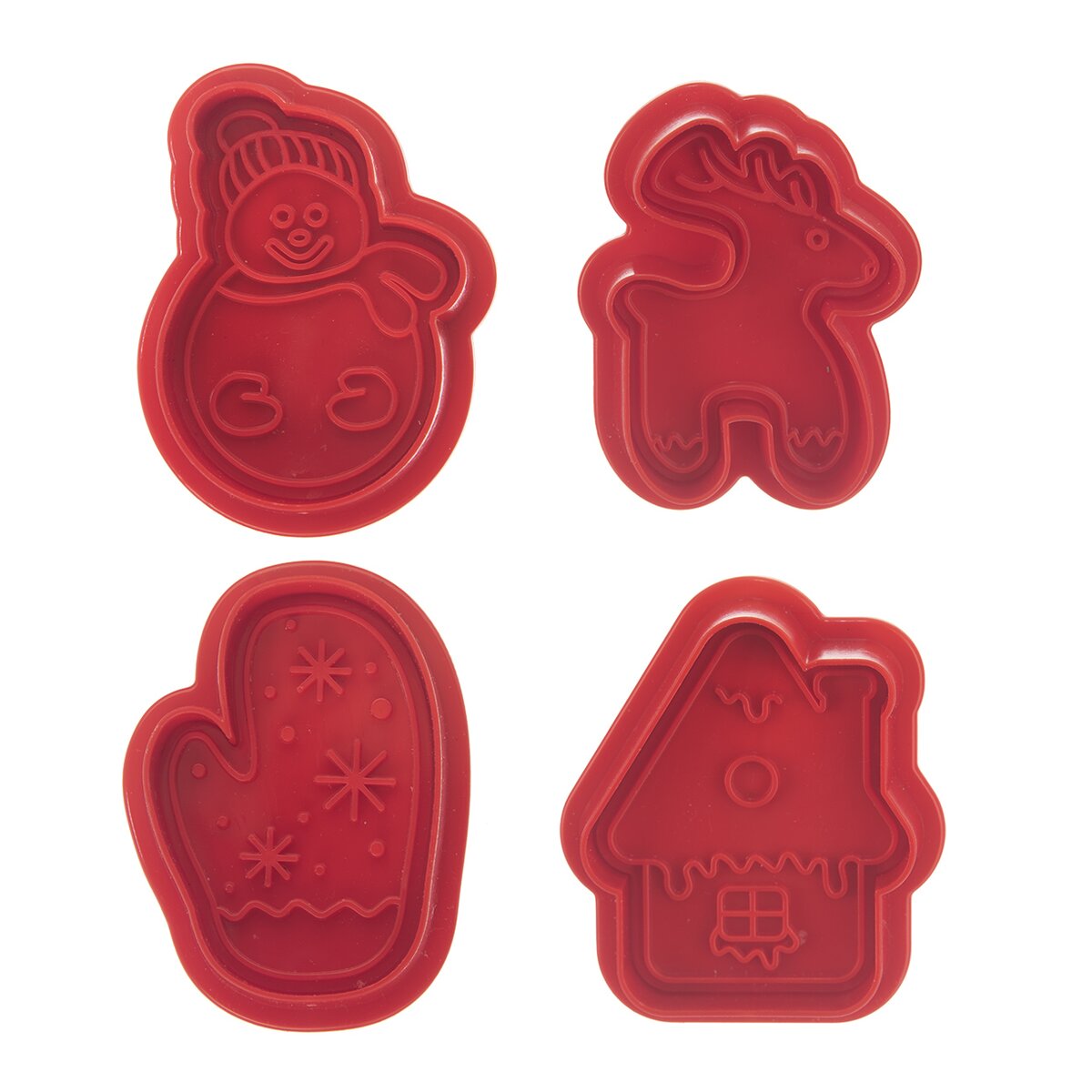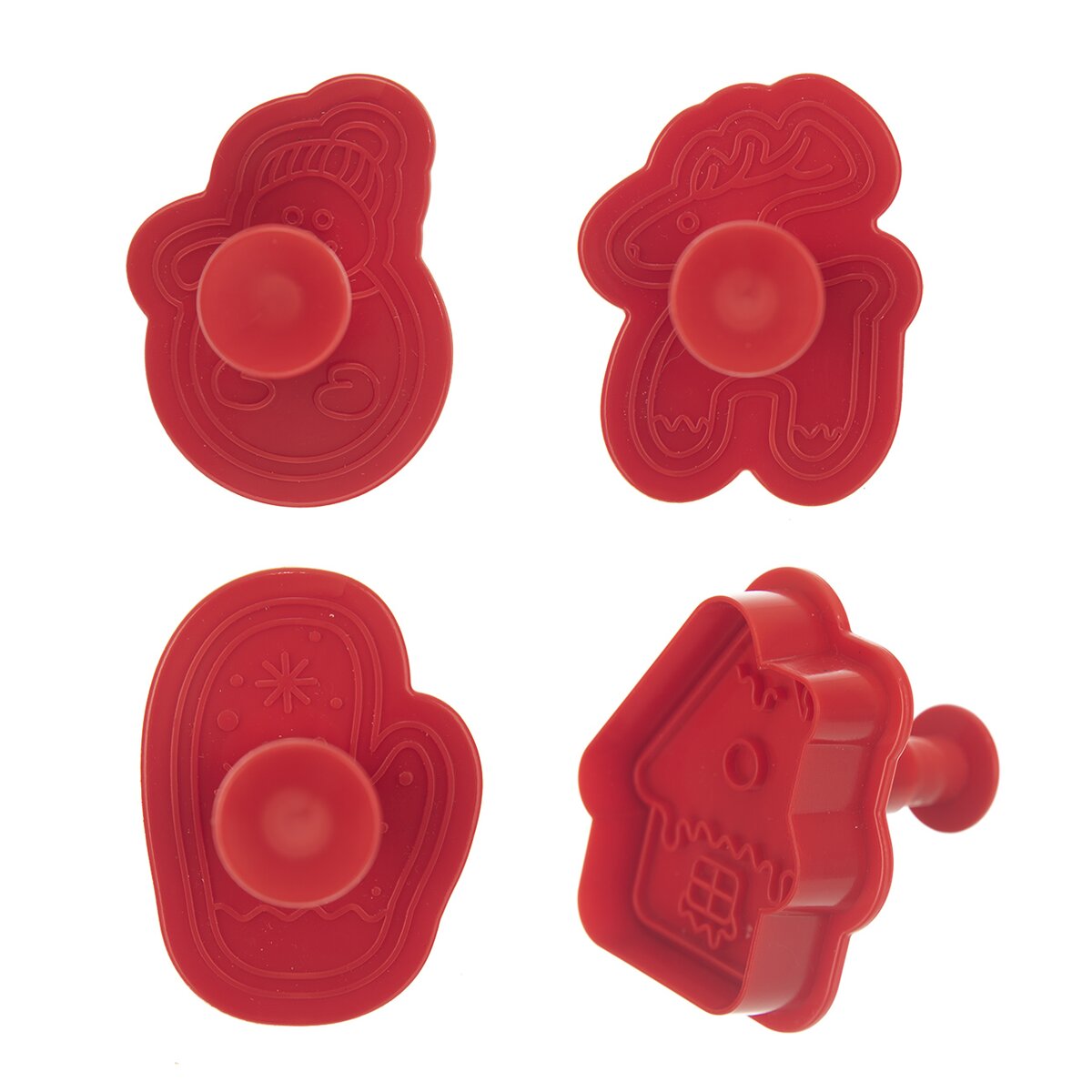 Kód produktu 127457Sada 4 kusů plastových vykrajovaček s pístem má na spodní straně razítko s vánočním reliéfem, který se otiskne do vyváleného těsta.