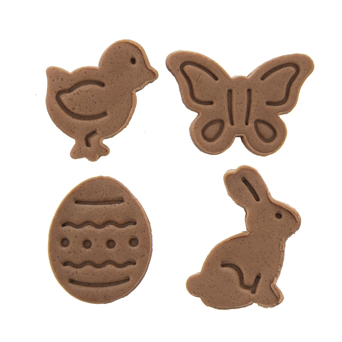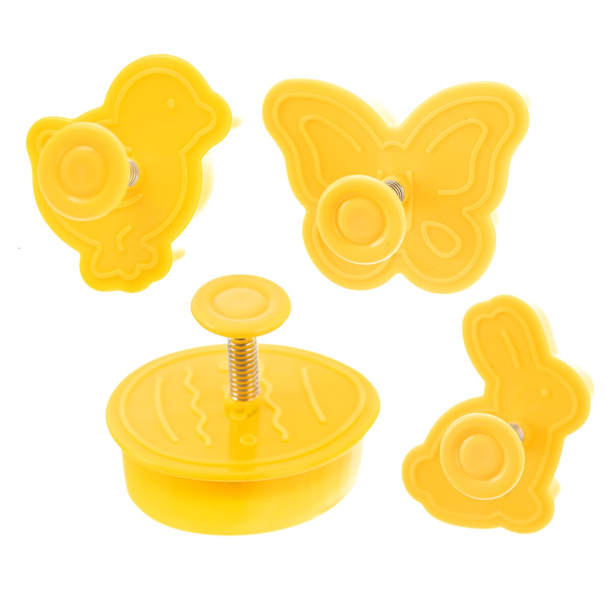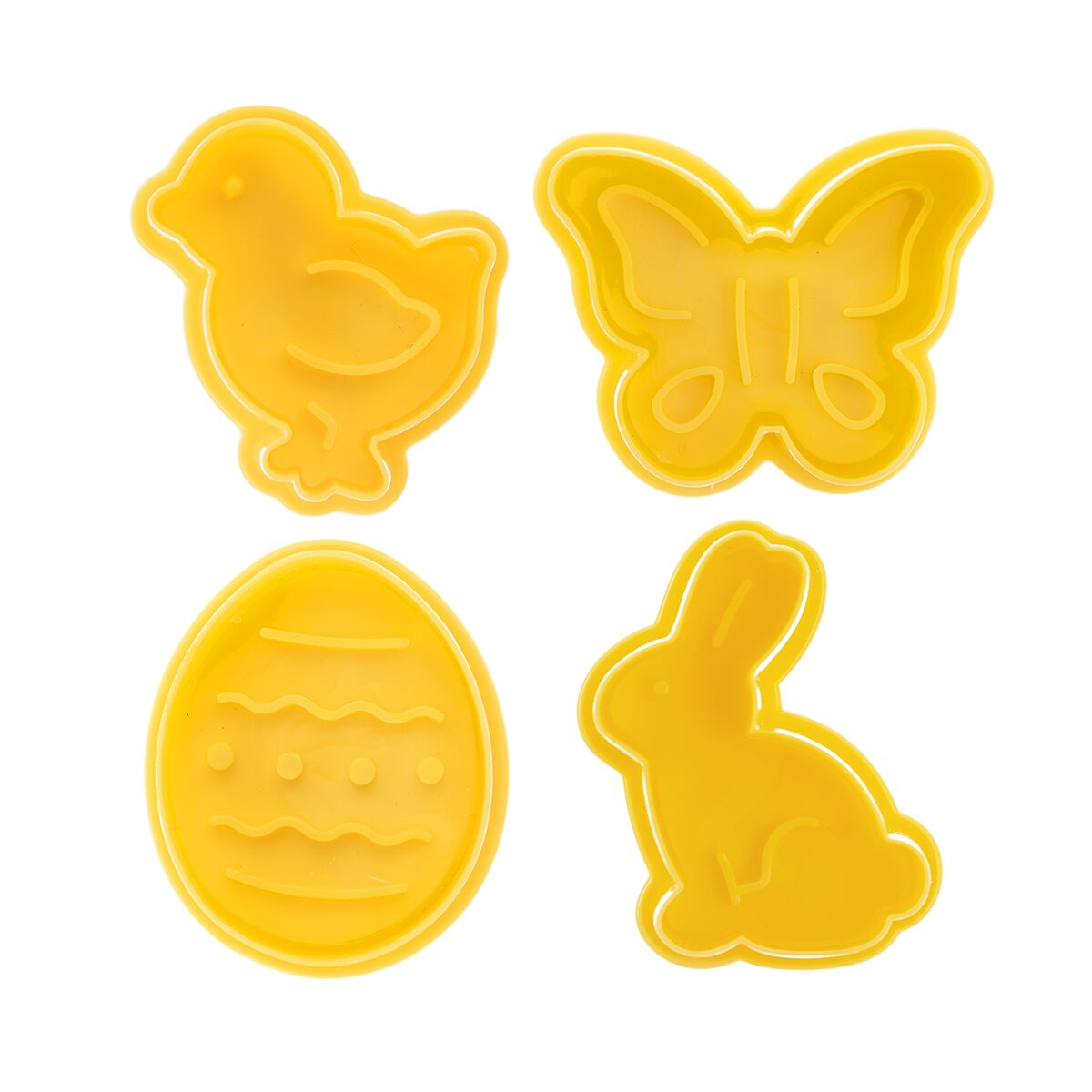 Kód produktu 127453Sada 4 kusů plastových vykrajovaček, opatřených pístem s plochou, která otiskne velikonoční reliéf do vyváleného těsta.