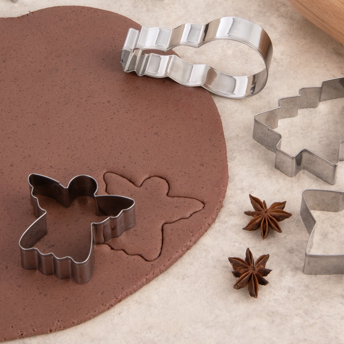 Rozměry vykrajovaček: sněhulák 5,2x9,5x2 cm, vločka pr. 7 cm, v. 2 cm, anděl 6,5x6x2 cm, zvoneček 8x7x2 cm, hvězda pr. 7 cm, v. 2 cm a stromeček 6x7,5x2 cm