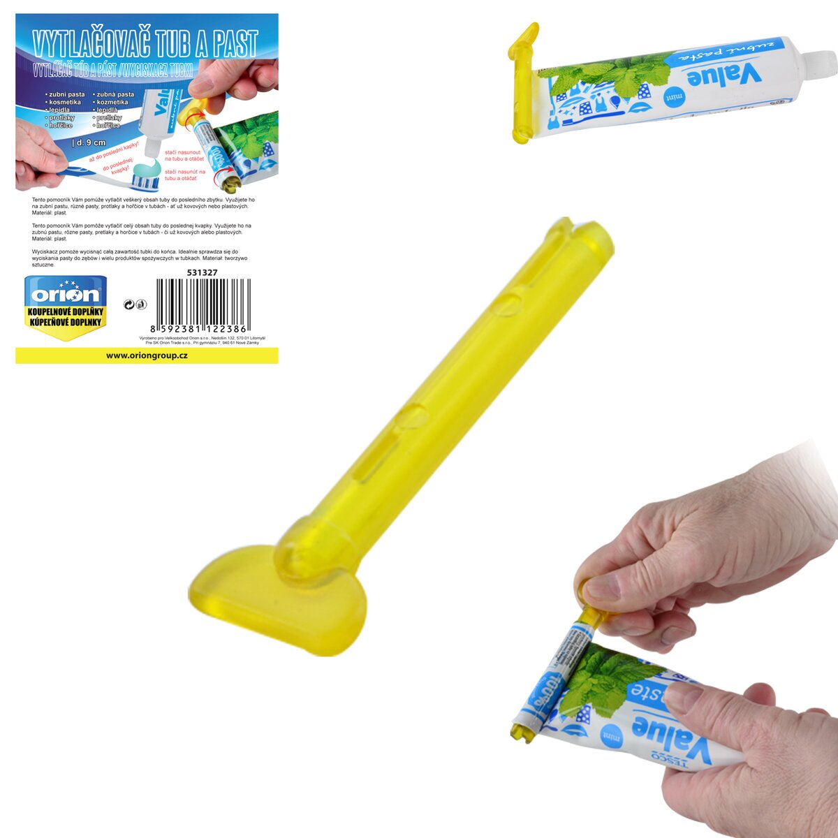 Kód produktu 531327Tento pomocník Vám pomůže vytlačit veškerý obsah tuby do posledního zbytku. Využijete ho na zubní pastu, různé pasty, protlaky a hořčice v tubách - ať už kovových nebo plastových, lepidla, kosmetiku. Materiál: plast. Rozměry: d. 9 cm.