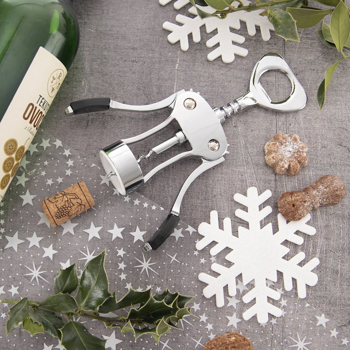 Kód produktu 140836Kovová vývrtka na víno s otvírákem láhví na korunkové uzávěry.