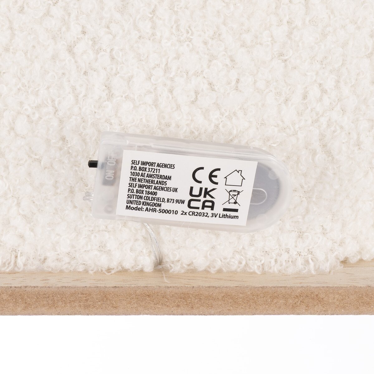 Zajíc je ze zadní strany napájen 2 kusy knoflíkových baterií CR2032 (jsou součástí balení), stačí jej tedy jen zapnout či vypnout. Je vyroben z polyesteru, MDP a PVC a je určen k vnitřnímu použití.