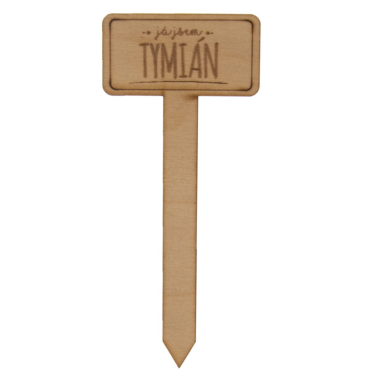 Po vysetí semínek bazalky si květináč nebo část záhonku můžete stylově označit dřevěným zápichem s vypalovaným dekorem a nápisem TYMIÁN.