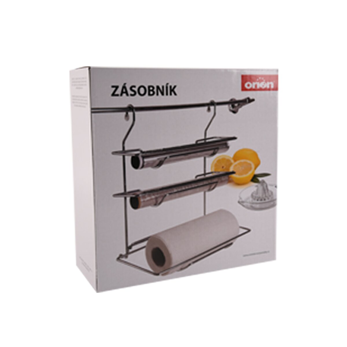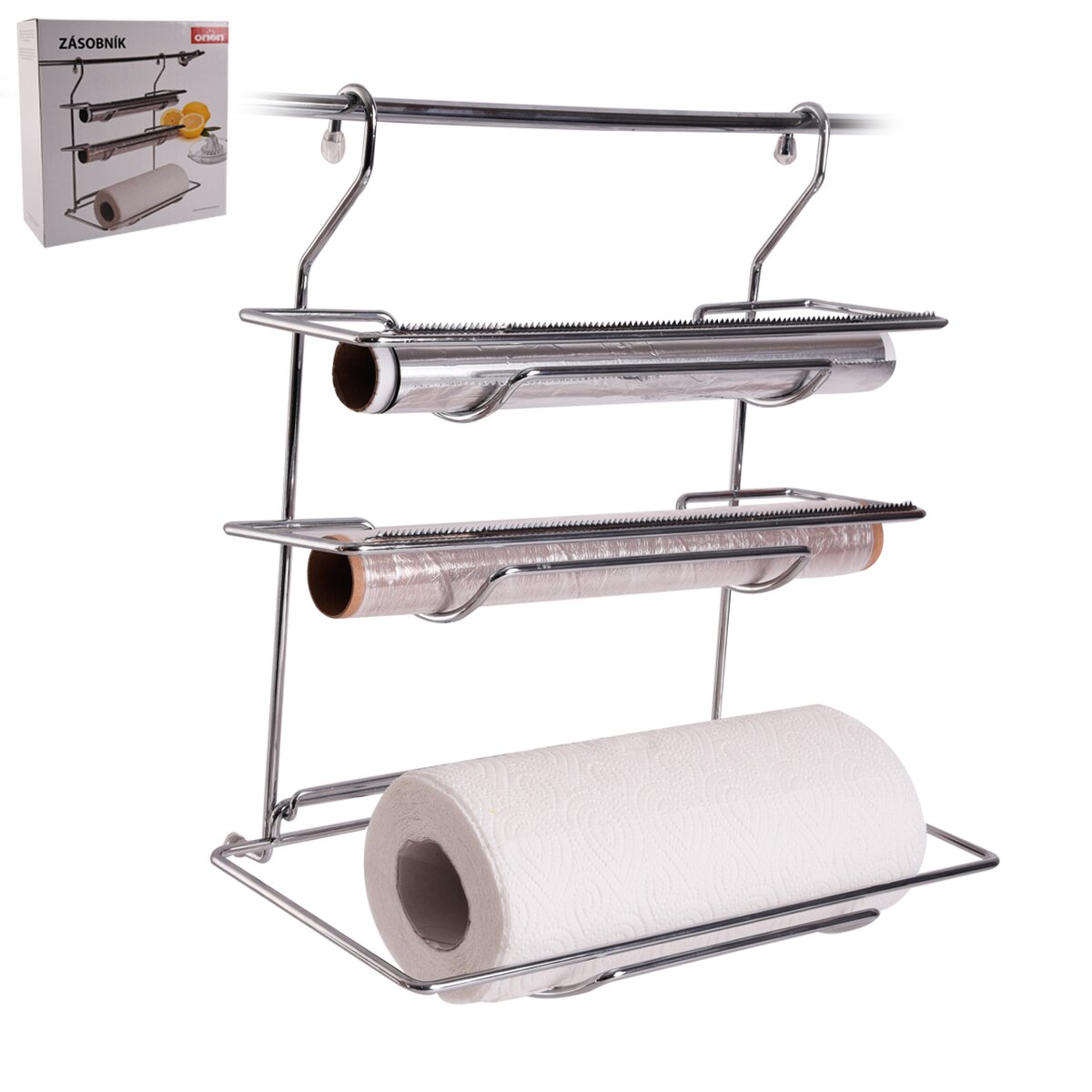 Zásobník na papírové utěrky, potravinářskou fólii a alobal snadno zavěsíte na závěsnou tyč. Budete mít alobal, fólii a utěrky vždy po ruce. Díky zubatému ostří snadno oddělíte požadovanou část. Materiál: kov – povrchová úprava chrom. Rozměry: š. 33 cm, h. 18 cm, v. 34 cm.