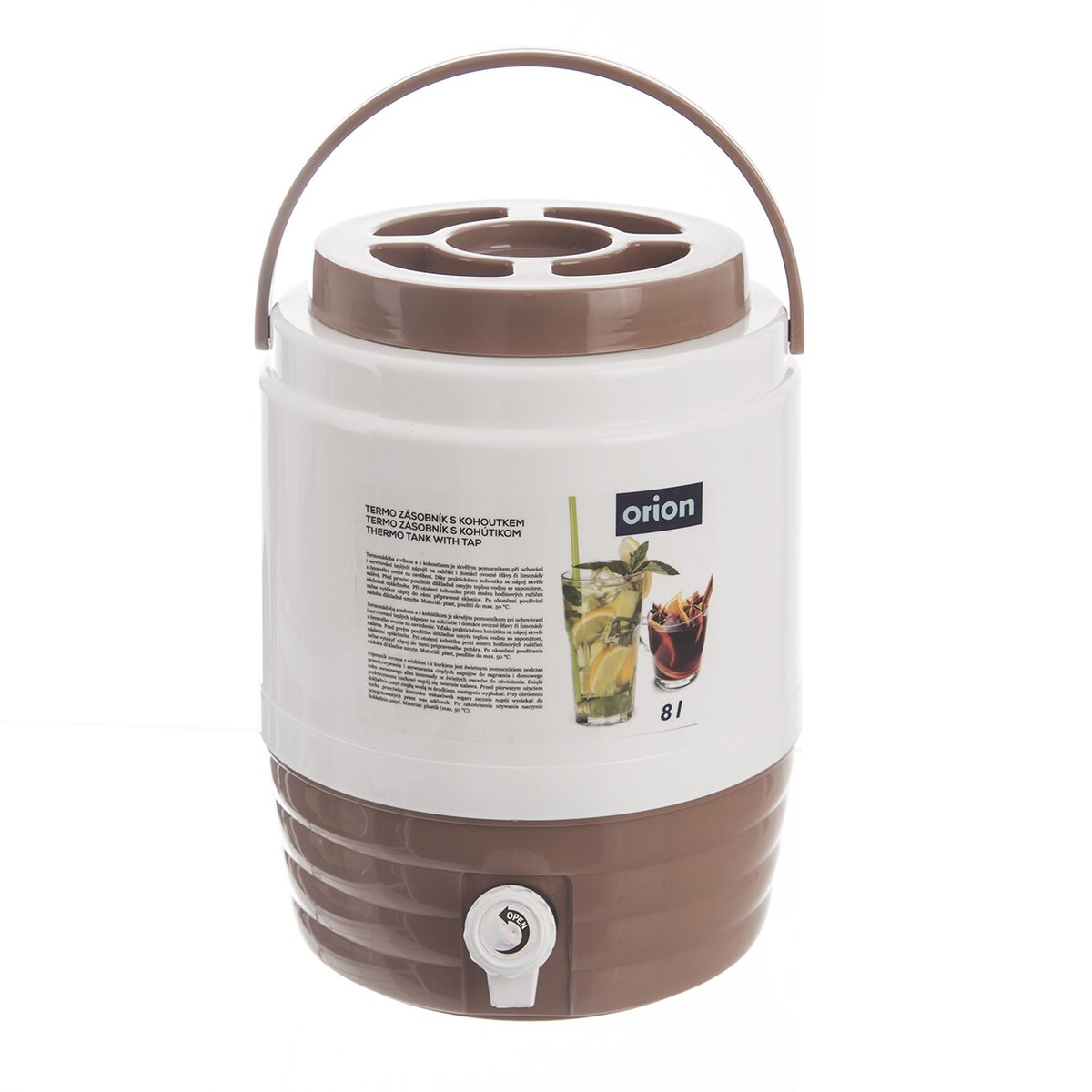 Kód produktu 150900Bílo-hnědý plastový termozásobník na teplé i studené nápoje o objemu 8 l s víkem a kohoutkem k dávkování nápoje.