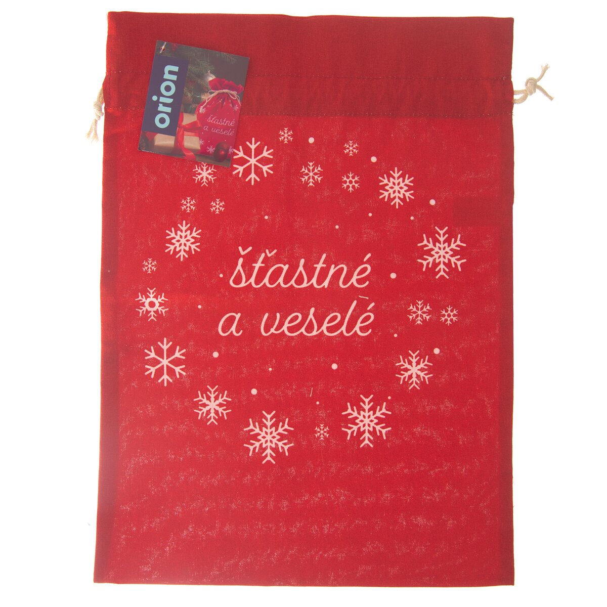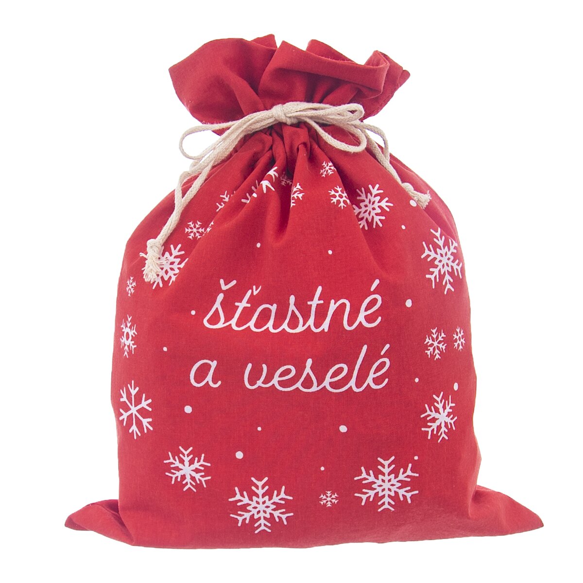 Větší červený látkový sáček s dekorem vloček a nápisem ŠŤASTNÉ A VESELÉ je určen k uložení dárků, např. originálních hrnečků, svíček, kosmetiky nebo na tzv. měkké dárky, které se špatně balí do balicího papíru. A na rozdíl od papíru jej lze používat opakovaně.