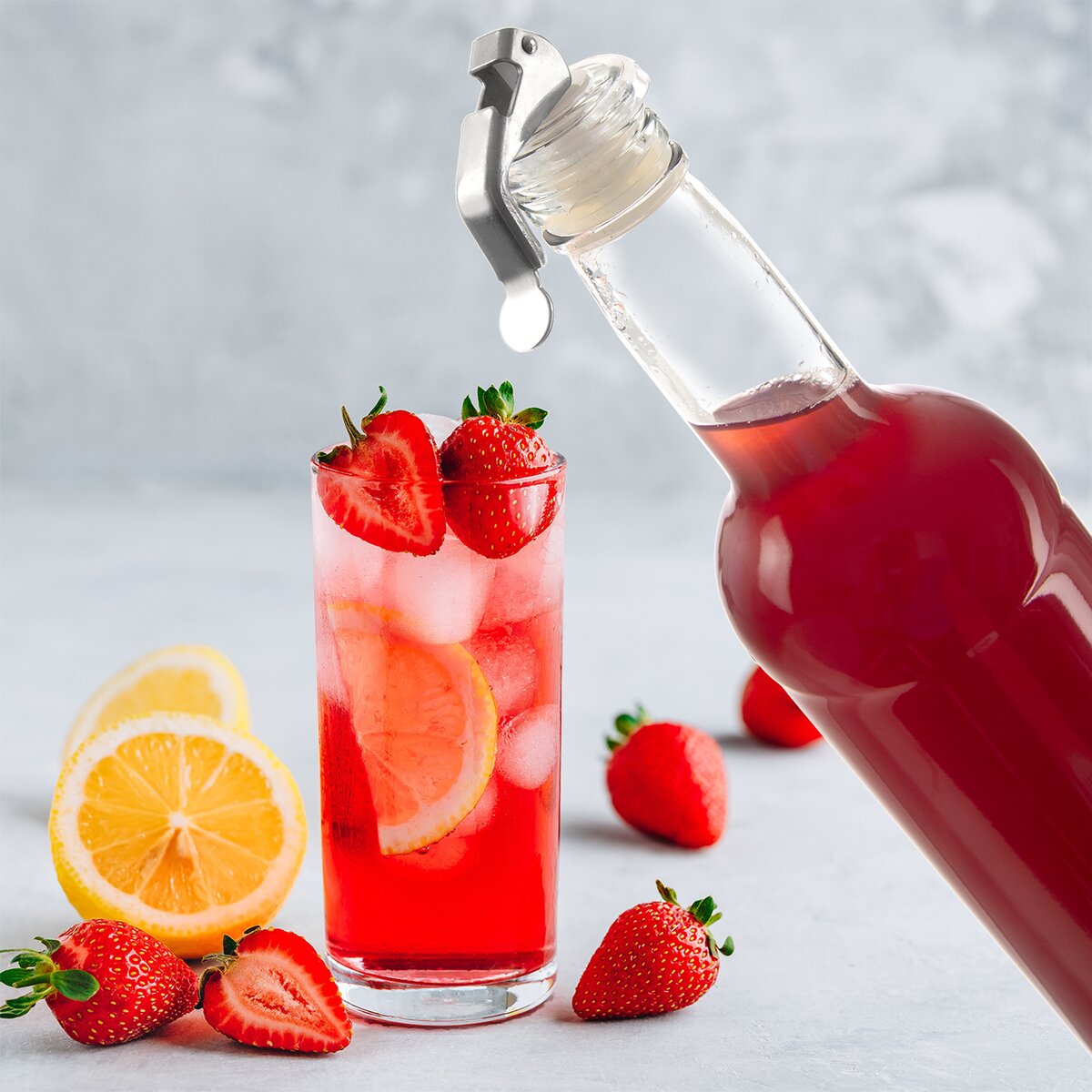 Řešením, jak utěsnit otevřenou láhev bio šťávy, domácí limonády nebo sirupu, je praktická zátka se silikonovým těsněním. Stačí ji vložit do hrdla a stlačit nerezovou páku dolů. Tím se hrdlo utěsní a nápoj se nevylije, zůstane čerstvý nebo perlivý.