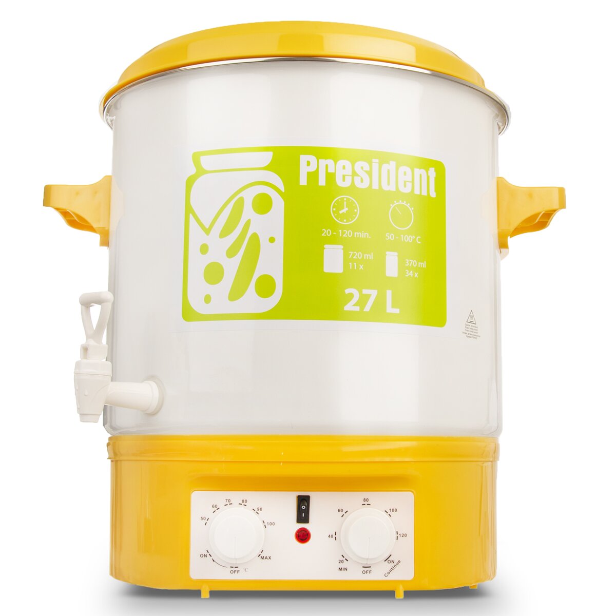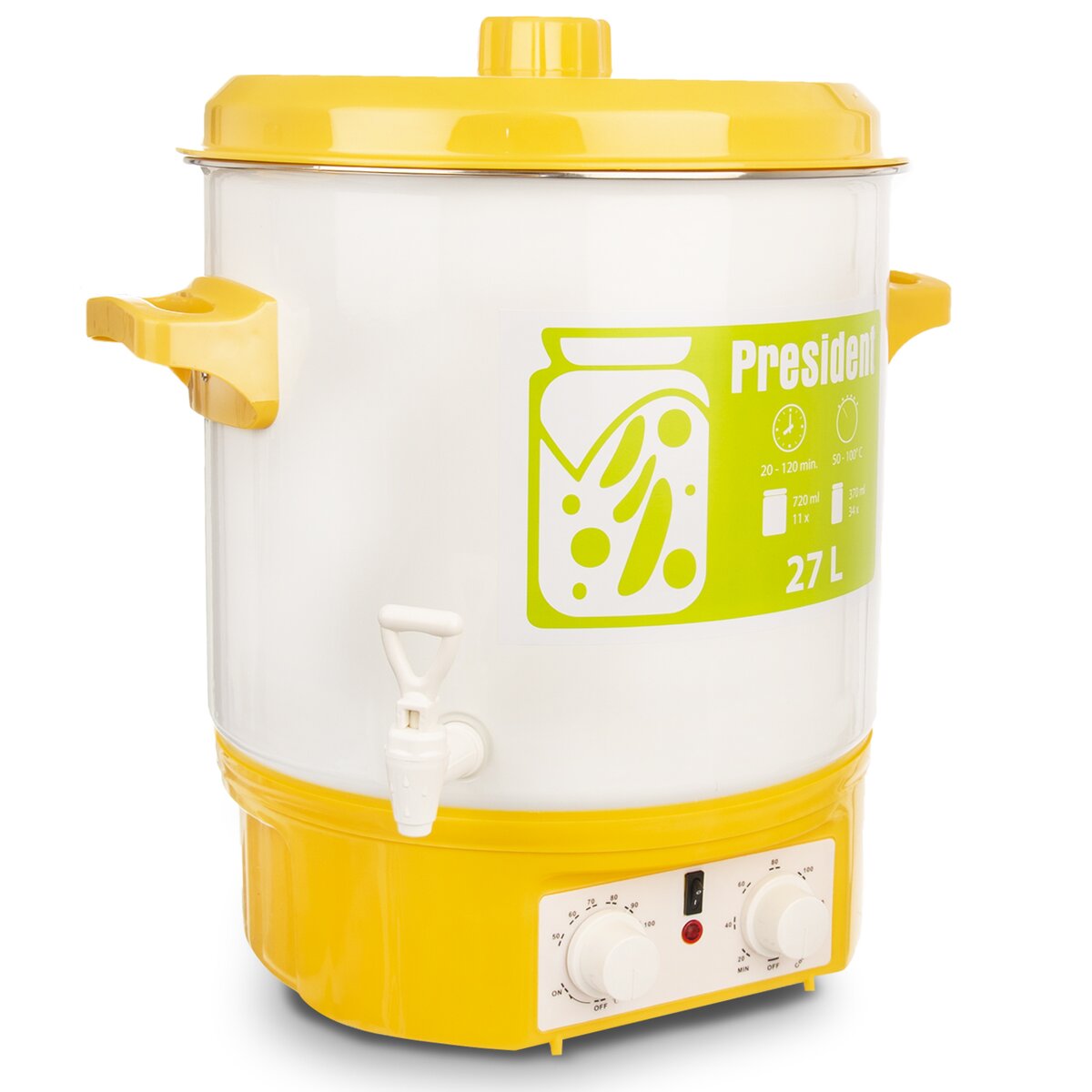 A aby bylo v čem zavařovat, přicházíme s praktickým elektrickým zavařovacím hrncem z kolekce PRESIDENT. Tento univerzální hrnec o objemu 27 litrů má smaltovaný, hygienicky nezávadný povrch a skrytý topný článek. K uzavření slouží praktické plastové víko. Díky jeho velikosti se do něho vejde větší množství sklenic, např. 11 sklenic 0,75 l nebo 34 sklenic 0,37 l.