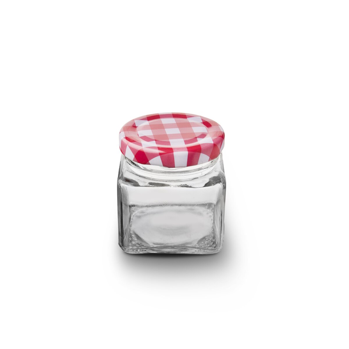 Kód produktu 129719Sada 4 kusů malých hranatých zavařovacích skleniček s károvaným víčkem, o objemu 75 ml. Ideální pro uložení koření, zavařování pečeného čaje, pesta a jiných pochutin.