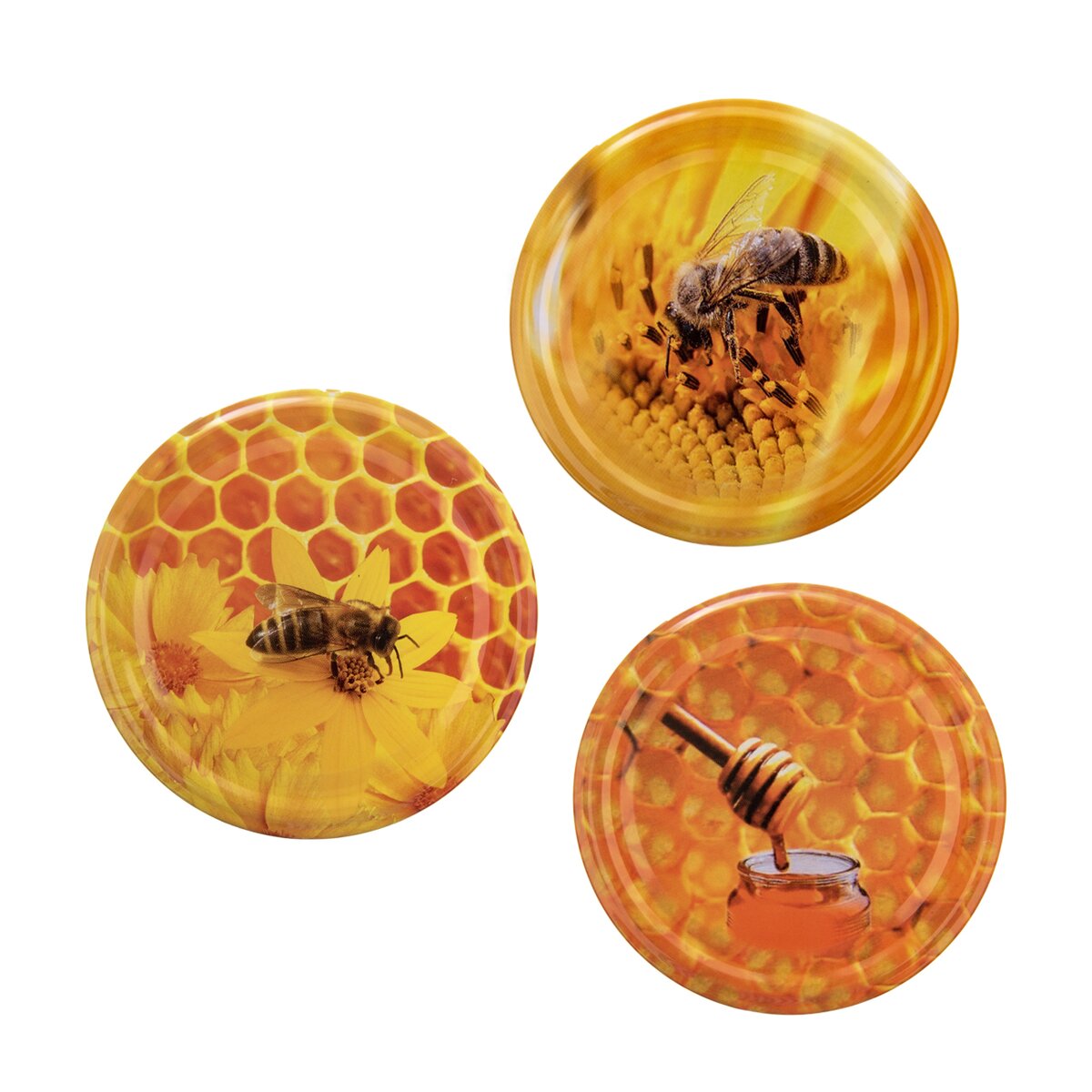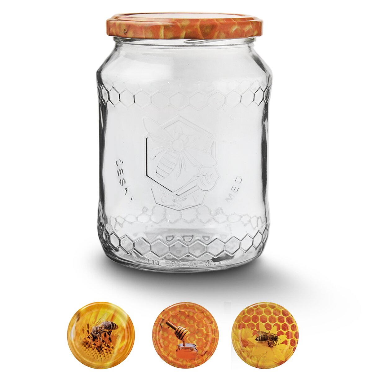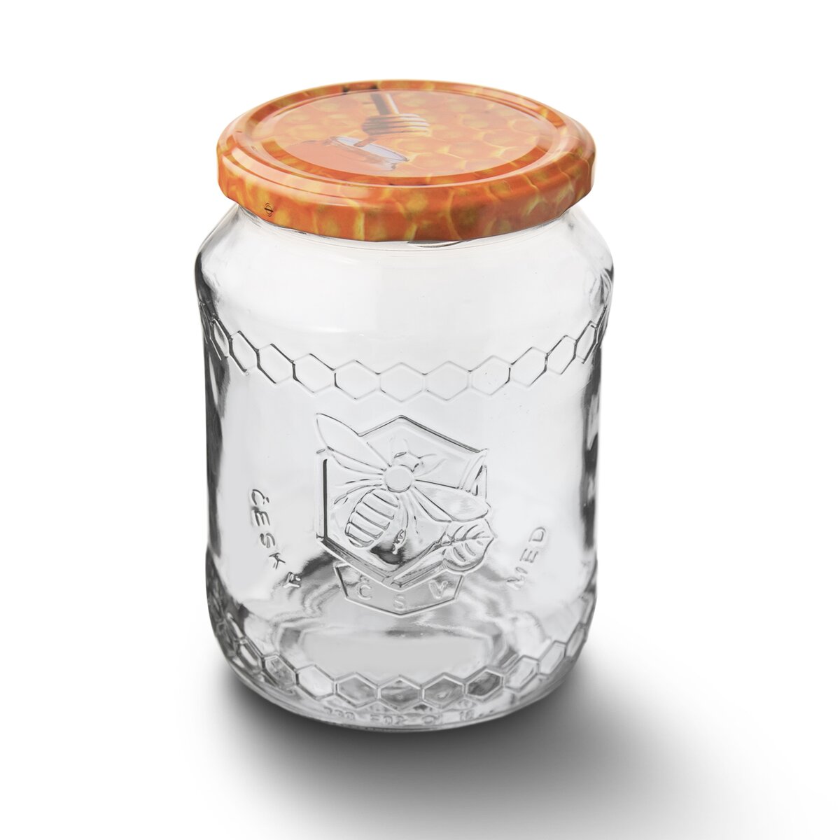 Zavařovací sklenice se stylovým reliéfem pro každého vášnivého včelaře, o objemu 0,73 l. S barevným kovovým víčkem na závit s motivek včelek a medových pláství.