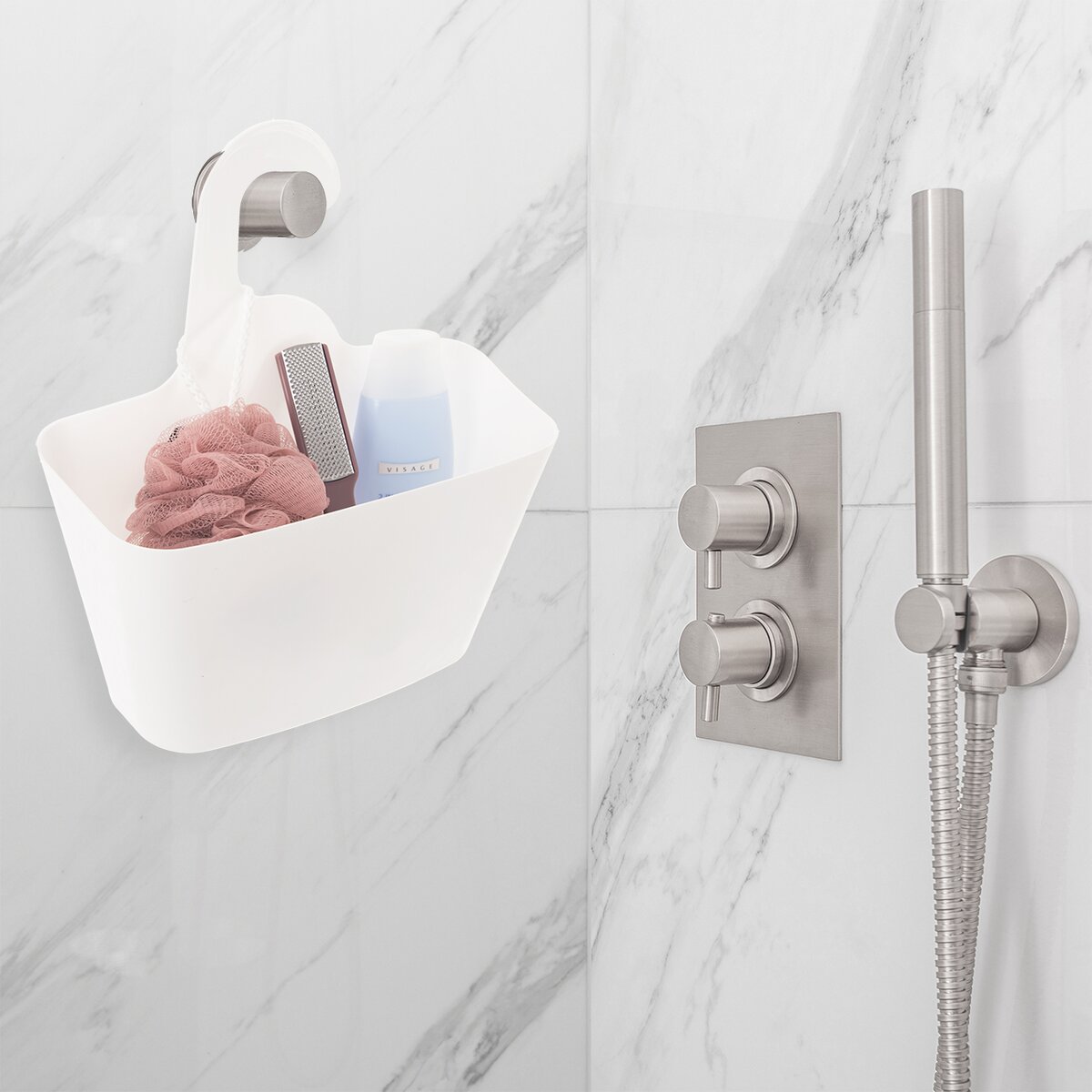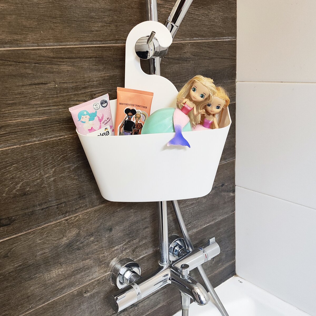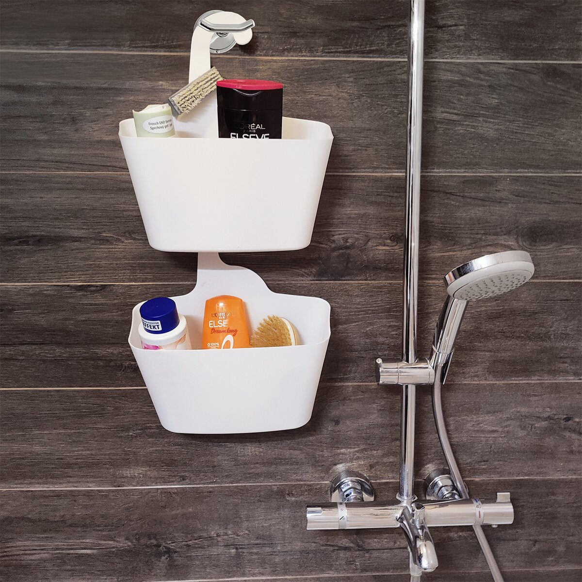 Kód produktu 731617Bílý plastový košík do sprchového koutu nebo k vaně je vhodný na zavěšení na vodovodní baterii, madla nebo úchyty. Slouží k uložení šampónů, kosmetických prostředků, mycí houby, masážního kartáče apod.