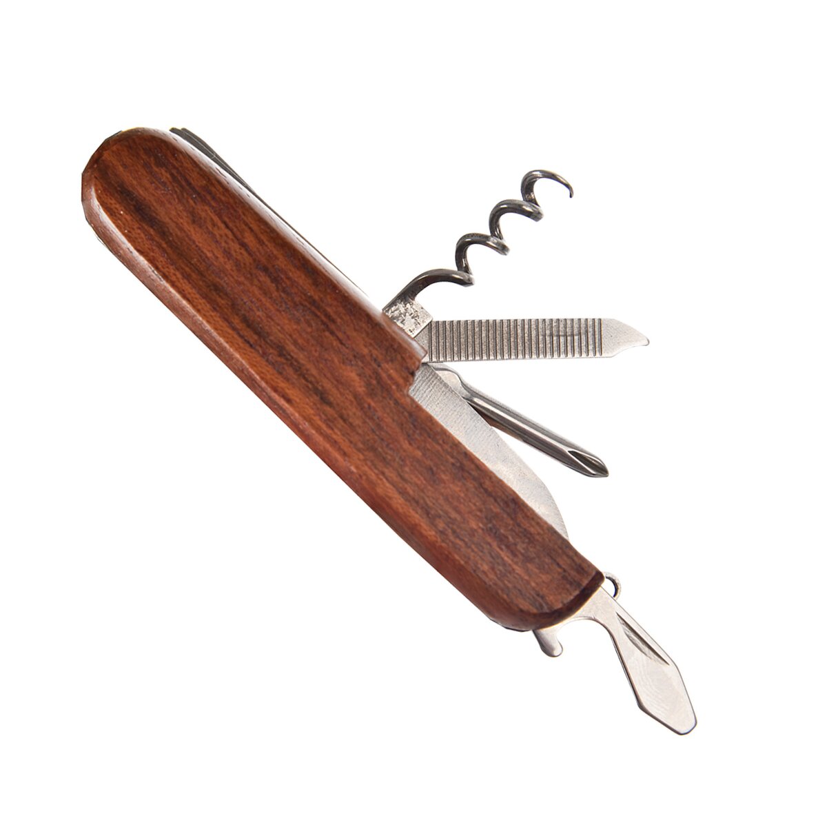 Obsahuje nůž s hladkou čepelí délky 5,5 cm, pilku na dřevo, nůžky, otvírák konzerv, křížový šroubovák, pilník, otvírák lahví se šroubovákem, vývrtku, výstružník a nerezový kroužek pro upevnění na klíče nebo karabinku. V případě potřeby jej stačí opláchnout v teplé vodě se saponátem a osušit.