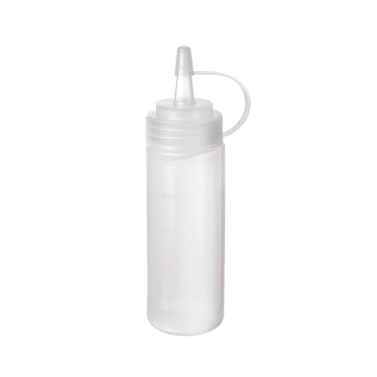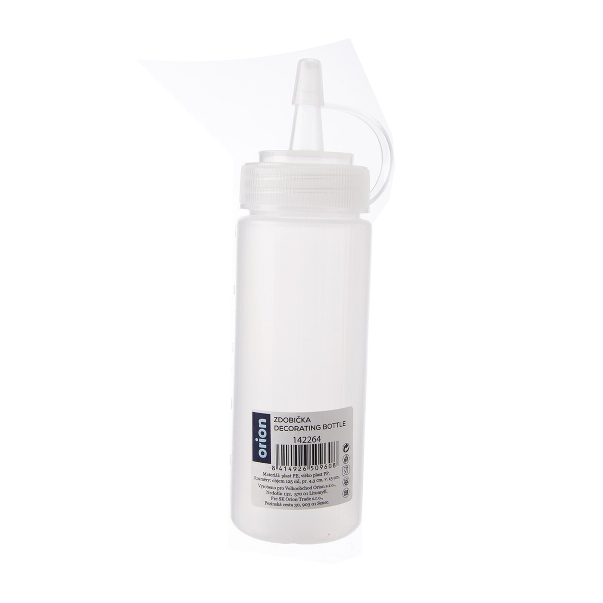 Kód produktu 142264Plastová zdobička se šroubovacím uzávěrem a špičkou s víčkem pro její uzavření má objem 125 ml a je určena k dávkování polev, řidších krémů, čokolády apod.