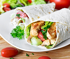 Tohle je klasika, která se nikdy nepřejí. Základem je hotová pšeničná tortilla, grilované kuřecí maso na kousky, spousta zeleniny a dip ze zakysané smetany.