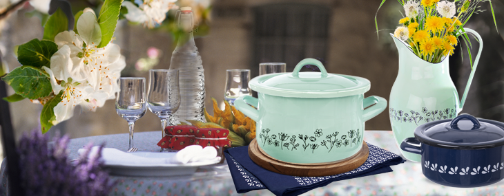 - smaltované nádobí TONČA – krémové zabarvení a lidový dekor je příjemným doplňkem pro rustikální, venkovsky pojaté chaloupky